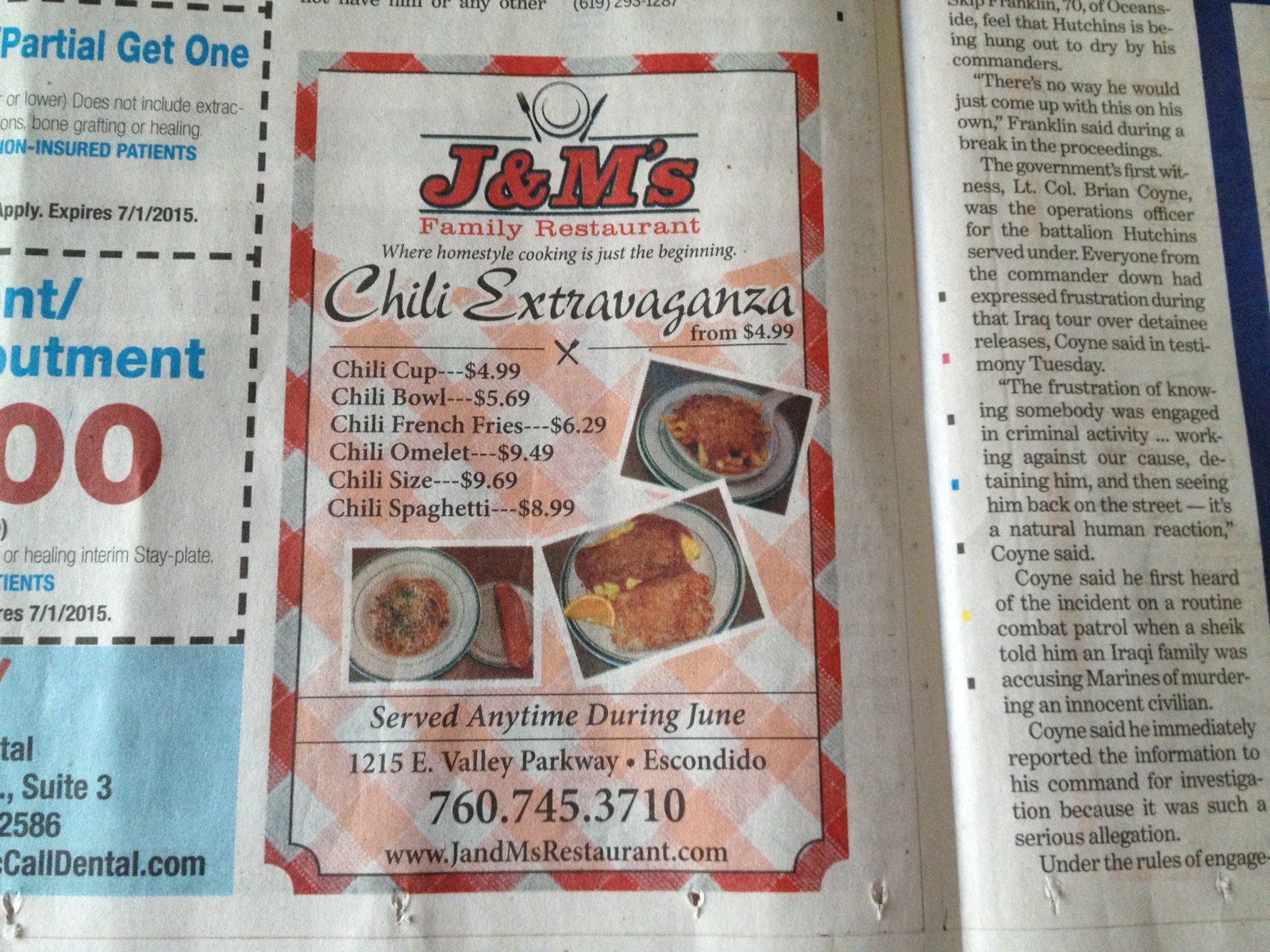 The week after we had been here, this small ad appeared in the Union-Tribune. It looks like a June-only promotion. When looking at the regular menu, chili is not listed anywhere.