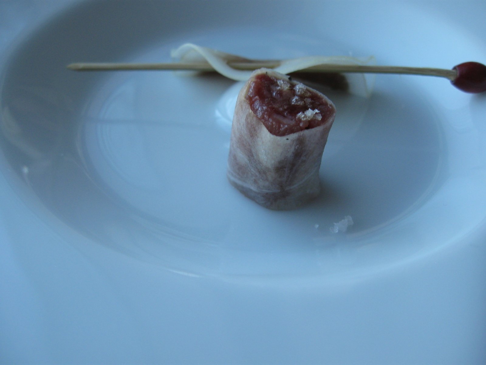 On another platter, a radish slice – looking like a mini tortilla – was folded over a shallot and sesame paste. Another radish slice was wrapped around truly excellent steak tartare lightly sprinkled with coarse salt, sortof a mini raw salami:
