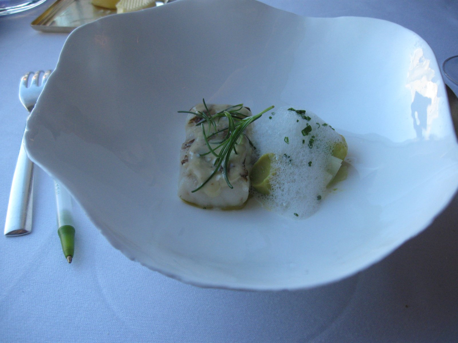Likewise, the turbot poached in Nantes butter (with avocado, leeks, baby clams, and butter foam) was fresh and well prepared. The mild whitefish matched perfectly with the more subtle flavors of the glass of Marsanne from Crozes Hermitage in the northern Rhône Valley: