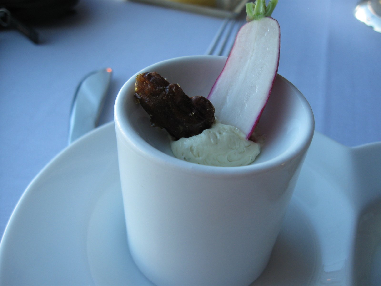 To amuse our mouths before our first course arrived, we received some tasty and interesting tidbits, like this slice of black radish with creamy herbed goat cheese and a large walnut half: