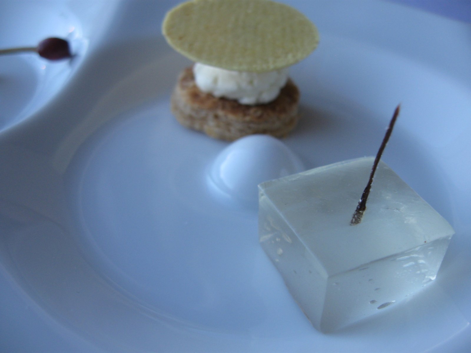 On another plate, there were two crunchy crackerly layers separated by a creamy filling; but the most memorable item on that plate was the gelatined martini cube: