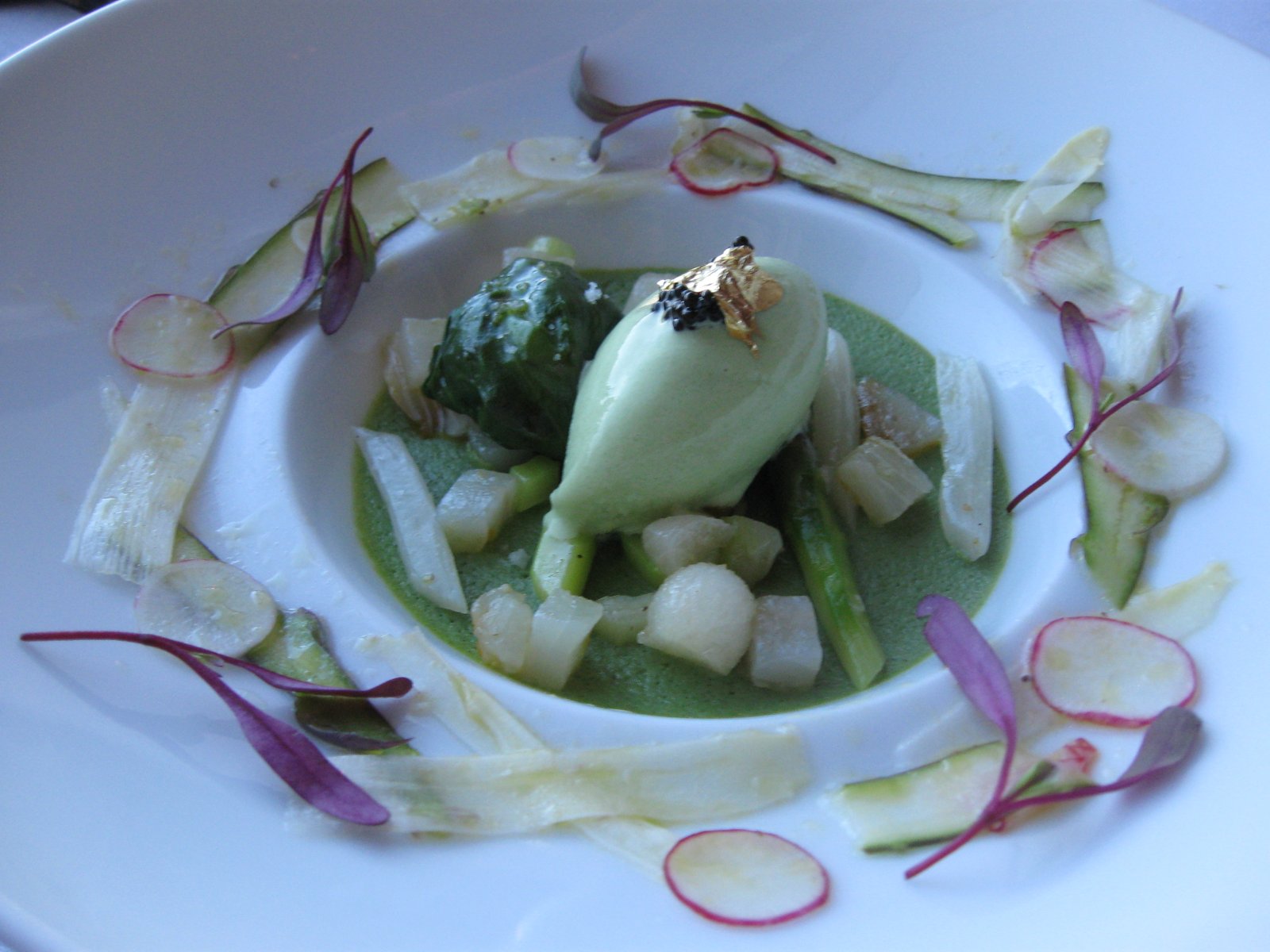At the bottom of the bowl lay an intense asparagus coulis that underlay the rest of the ingredients – including asparagus spears – and brought them together. Contrasting with the asparagus were the chunks of smoked hamachi and Asian pear. Cubes of another smoked fish were hidden inside the spinach leaf pouch, and the very thin radish and cucumber slices around the edge added crunch to the whole dish. Perhaps most interesting was the scoop of broccoli ice cream topped with caviar and gold foil. While this sounds like a mélange of flavors, the dish as a whole exceeded the sum of its parts. Even the smoked fish somehow enhanced the springtime flavors of the other ingredients.