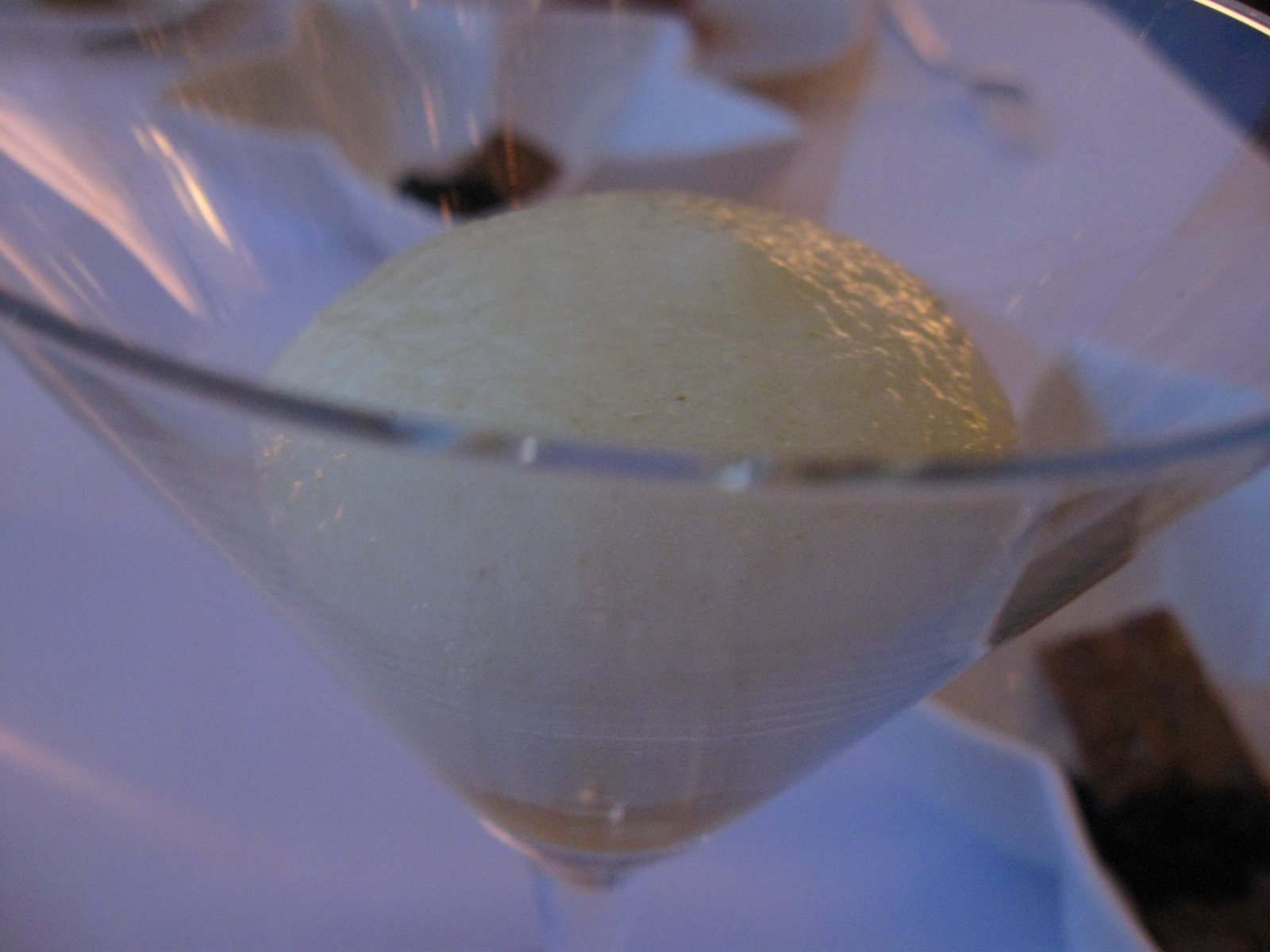 I believe this martini glass has green apple foam on top of vanilla ice cream on top of a sweet fruity (mango?) surprise at the bottom: