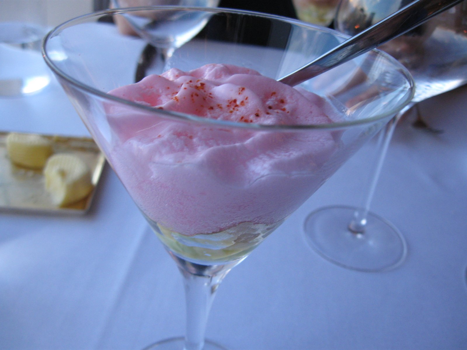 At this point, we were given a palate refresher – rhubarb foam on top of crushed pineapple. Not only was this cool and tasty, it gave us a chance to pause and reflect and finish our last white wine: