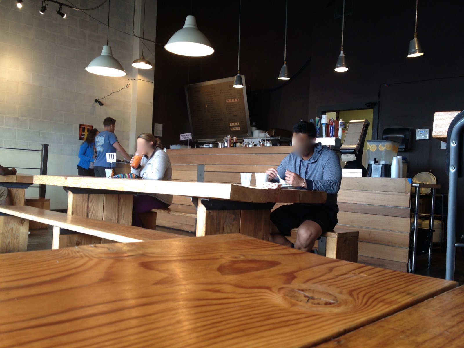 Tables of various size and height are in the front area, along with a water dispenser, napkins and condiments on the counter and there are also a few tables in the back.