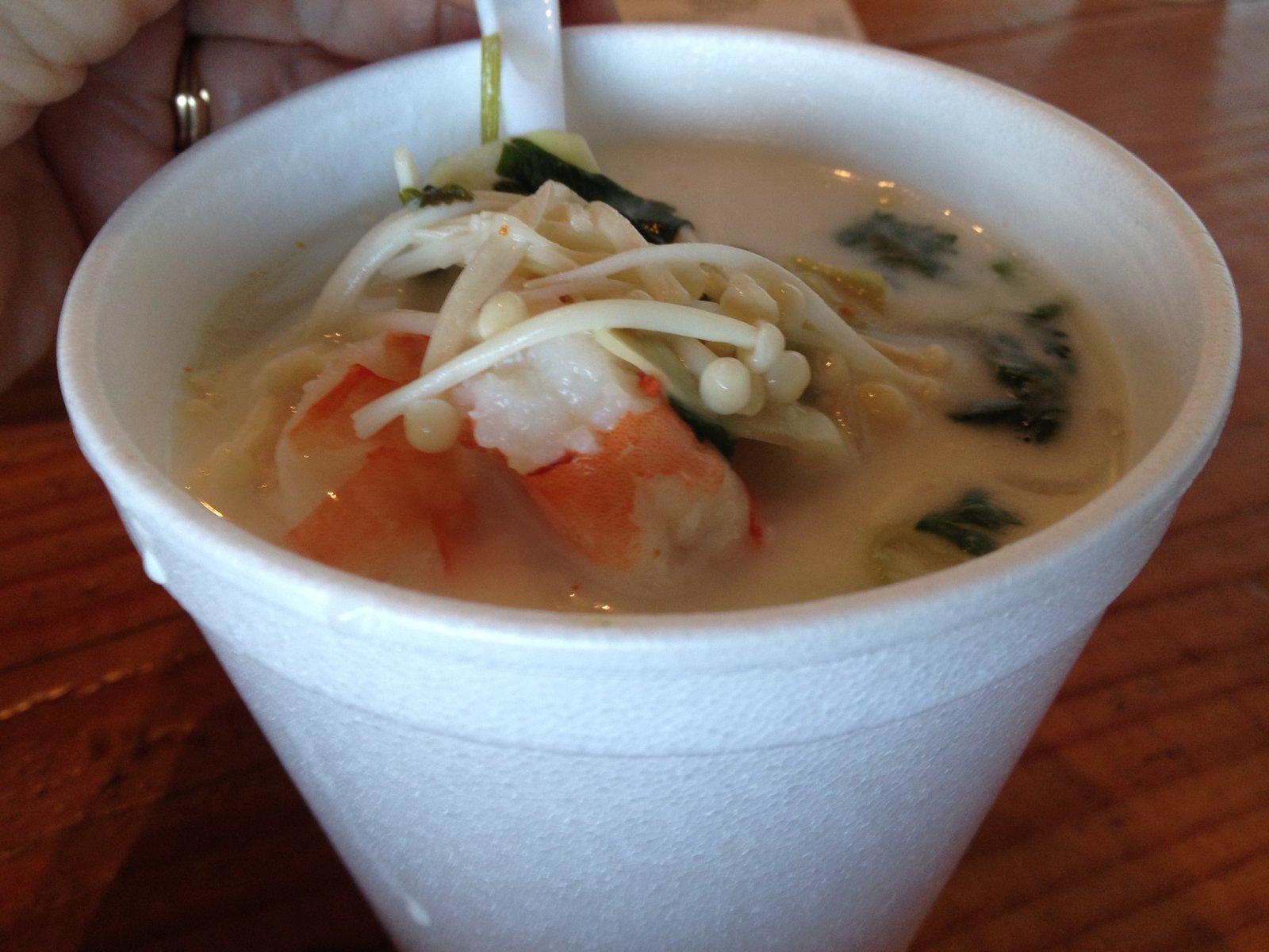 This time, we tried the Tom Kha soup, with shrimp ($4). I wanted to try the J&T version of this coconut milk based soup and was not disappointed. Three large shrimp were in the pint sized container. Quite wonderful, and something I will return and order.