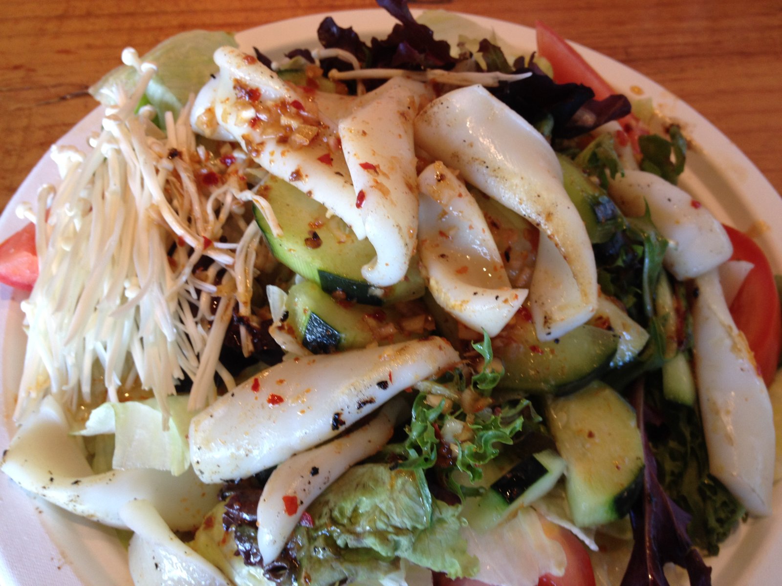 The Mister and I returned for another visit and this time chose the calamari salad ($7)…again, same fresh greens, choice of dressing (I do seem to like the spicy lime the best, but all three are quite good) and this time topped with freshly grilled to tenderness calamari pieces. Another excellent salad.