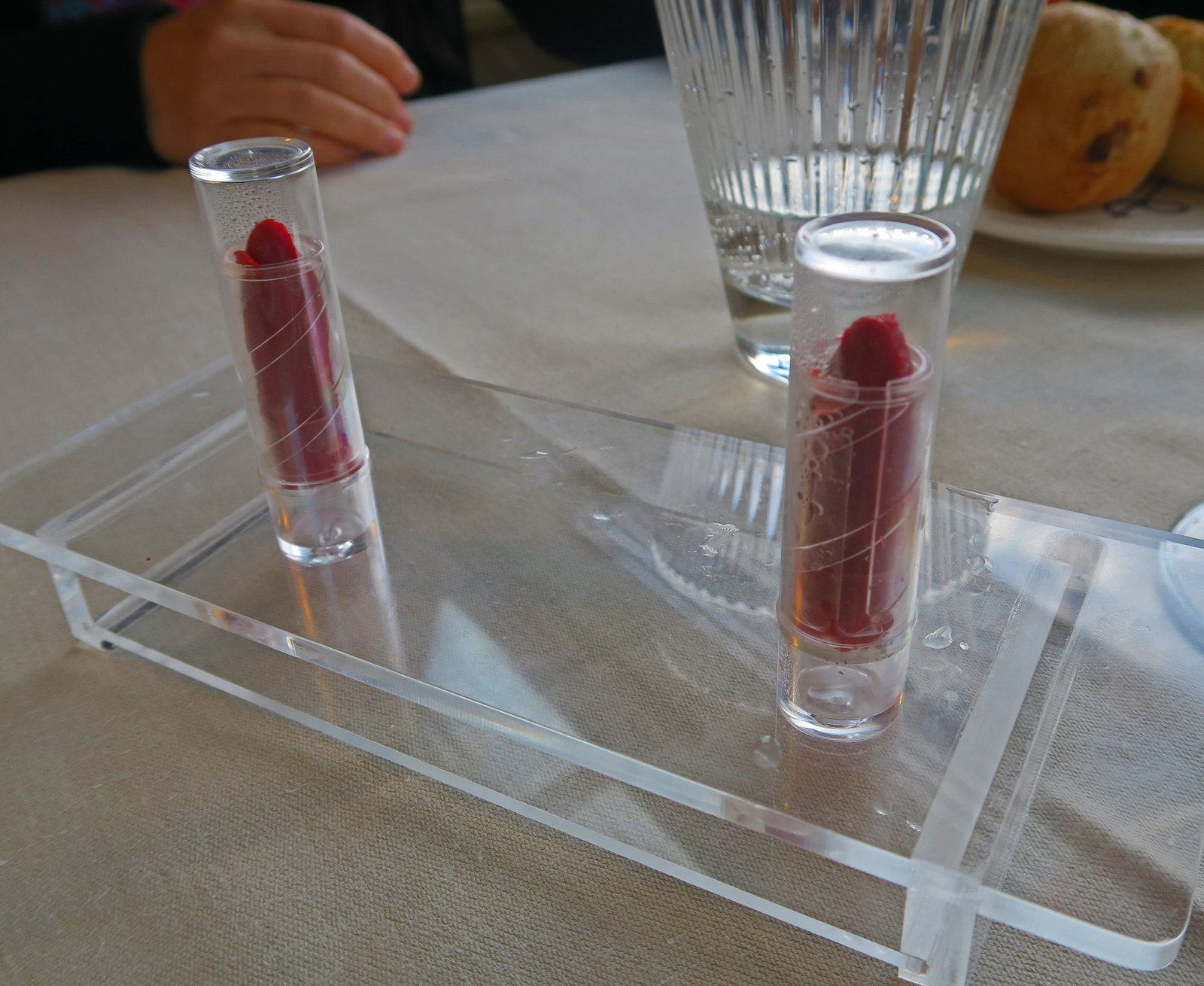 I really didn't do much research on Etxanobe. In fact, I made reservations at pretty much the last minute; a week before leaving on our trip. I had gotten the feeling that it would be a nice addition to the two other Michelin worthy meals on the trip having a more traditional Basque influence. So imagine my amazement when these tubes of "lipstick" arrived….Sardine Lipstick actually. Very tasty sardine mousse, just enough oil and fish flavor, and quite delicious….so delicious that I don't even remember the other amuse!