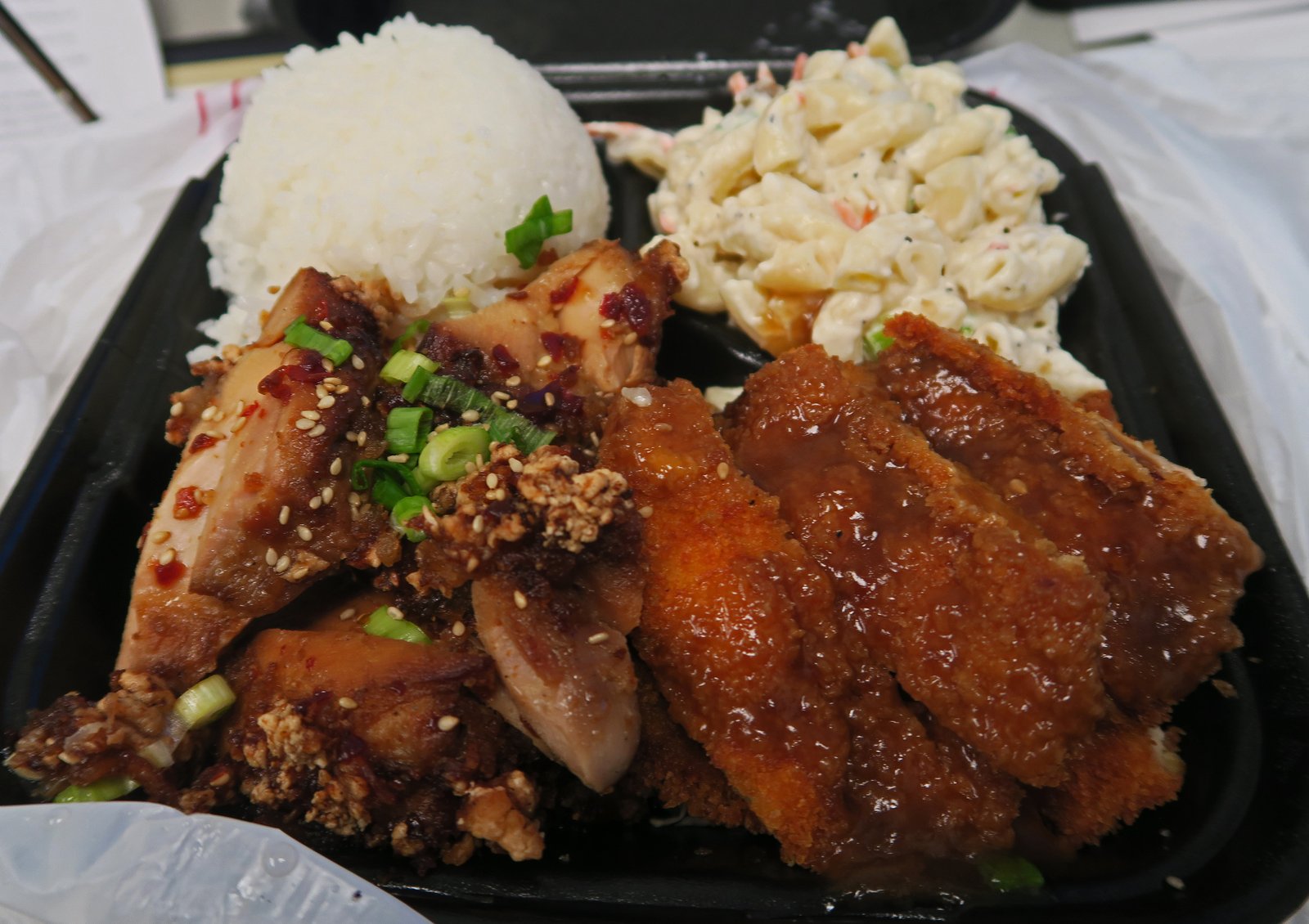 The Korean Chicken flavor was a bit on the weak side and perhaps was not marinated long enough? The katsu and gravy was nice, notice no breading falling off? It was also moist and the gravy (plus a dash of Tabasco) added layers of texture and flavor. I had one spoon of the mac salad which tasted a bit off…..a bit sour, so I decided to 86 that.