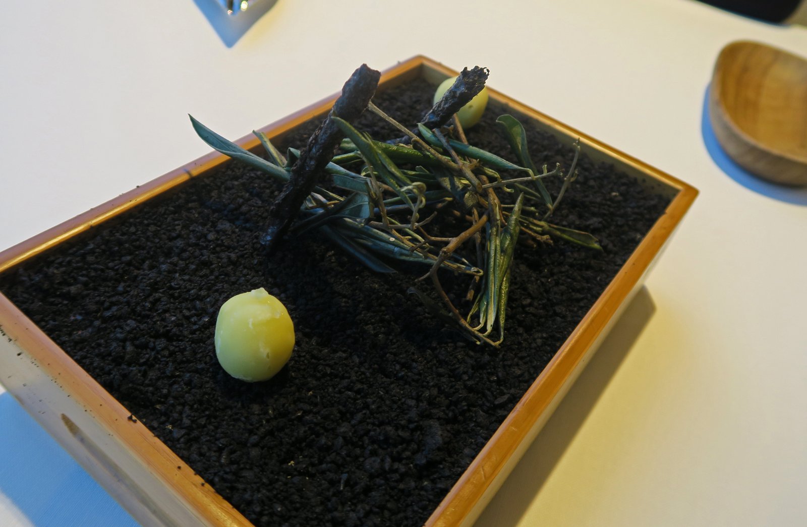She guided us around the greenhouse pointing out the various plants…often pointing out the little basket hanging; say, on a branch, loaded with what looked like tree bark. It would turn out to Jerusalem Artichoke made to look like tree bark with a citrus gel……..a bit too strong and somewhat bitter for us.
