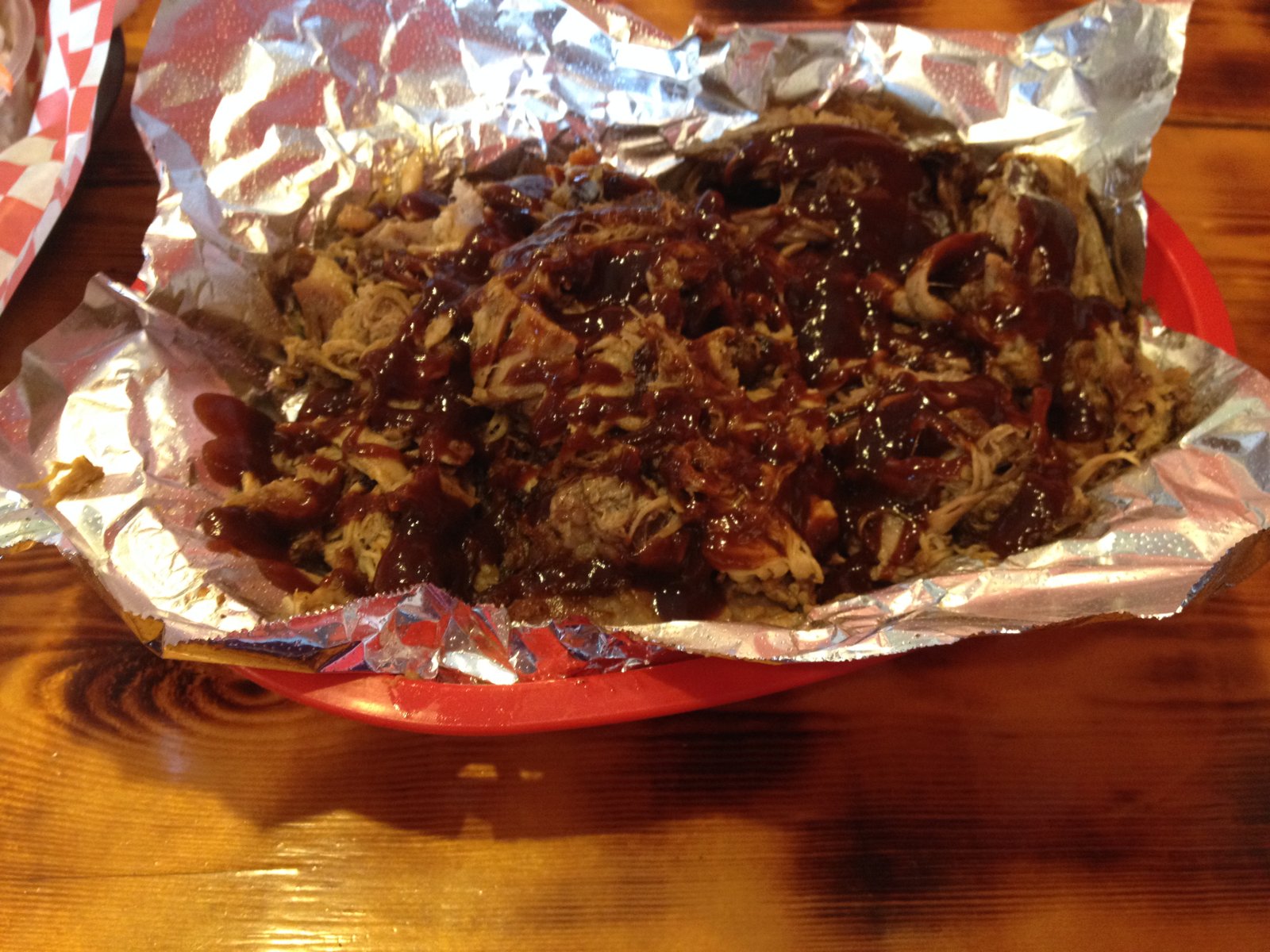 I was happy trying pieces of meat without any sauce, and got only a light smoke flavor from the pork.  The sauce was complimentary to the meats, yet not needed.