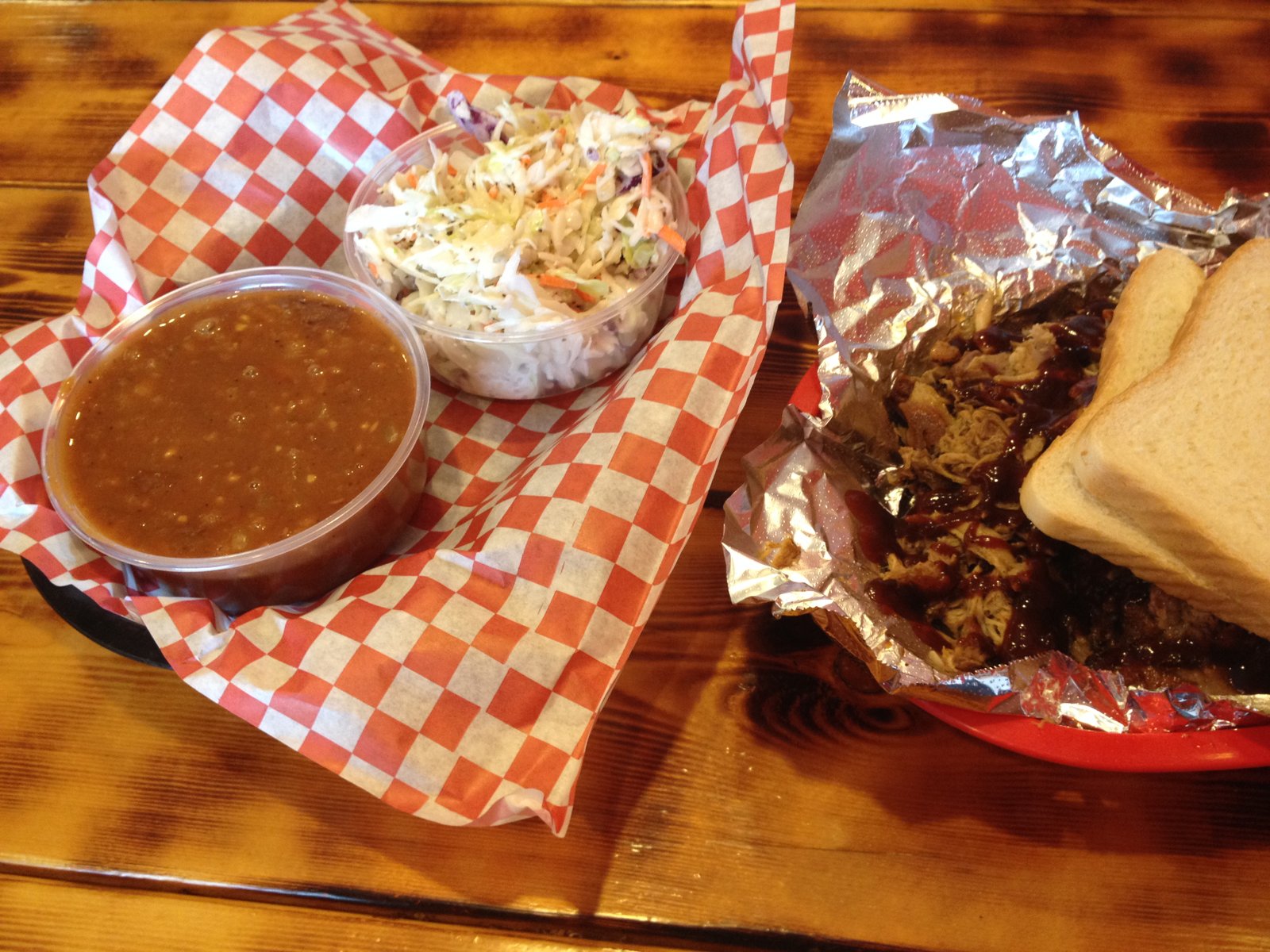 That is the entire menu above the counter in that second photo.   The meat is smoked here, behind the building.  We were here one day just after opening (11 a.m.; closed on Monday) and all of the menu was available. IMG_9968Deciding we were going to share and being unable to agree on what, we chose the Cowboy Plate ($13.99).  Two meats and two sides…and two slices of white bread.IMG_9969The sides we always choose seem to be cole slaw and baked beans.  The slaw was good: fresh, crispy, cool and just creamy enough…no real spices added.