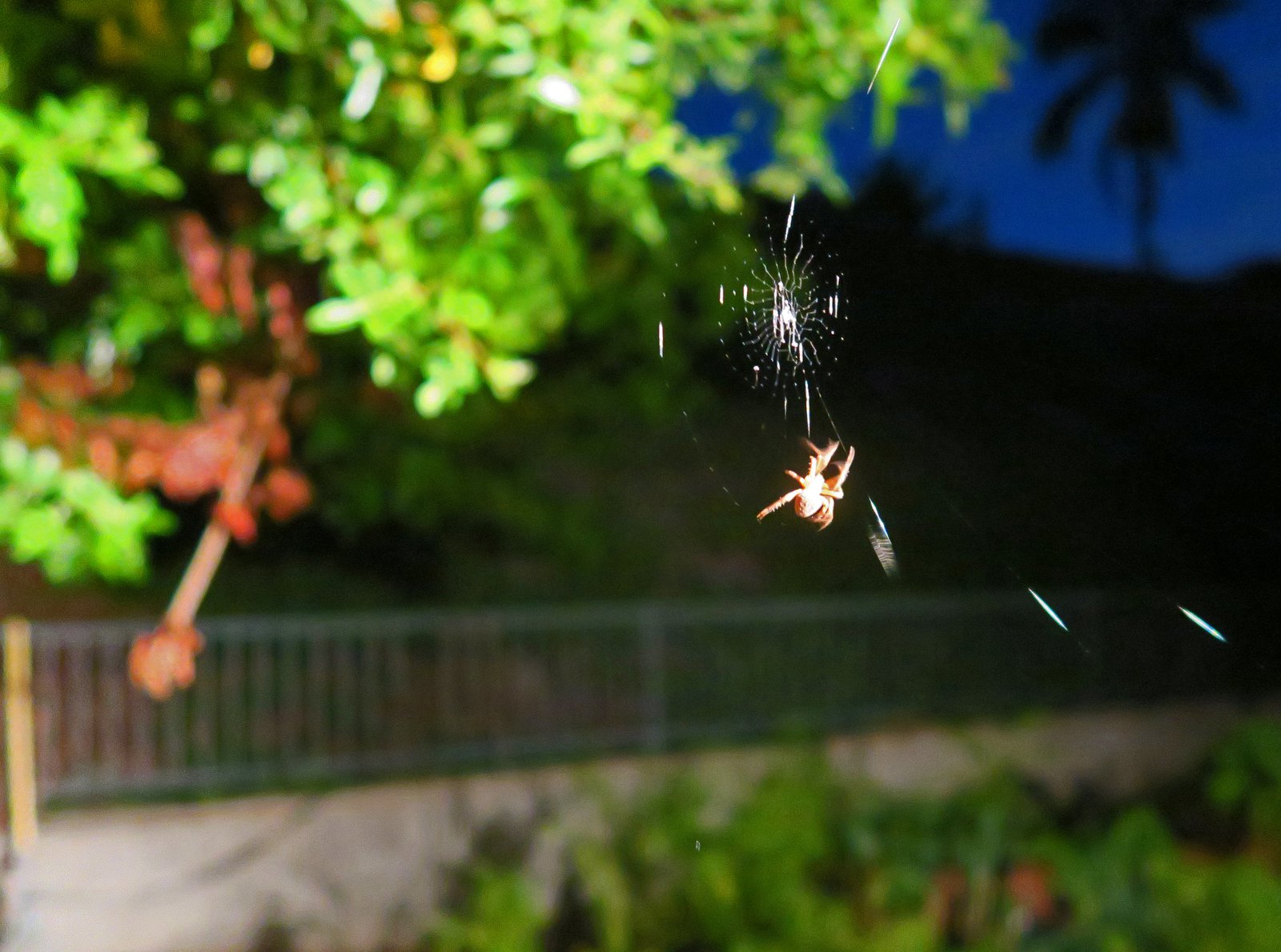 A few weeks back, I went into the back yard to check things out before heading off to bed. I noticed this hard working little fellow….building what seemed to be the world's most ambitious web. Since then, I'd check every night to see if the spider was out there spinning his web. If I saw a work in progress, I'd grab a beer from the fridge and just sit and watch…..