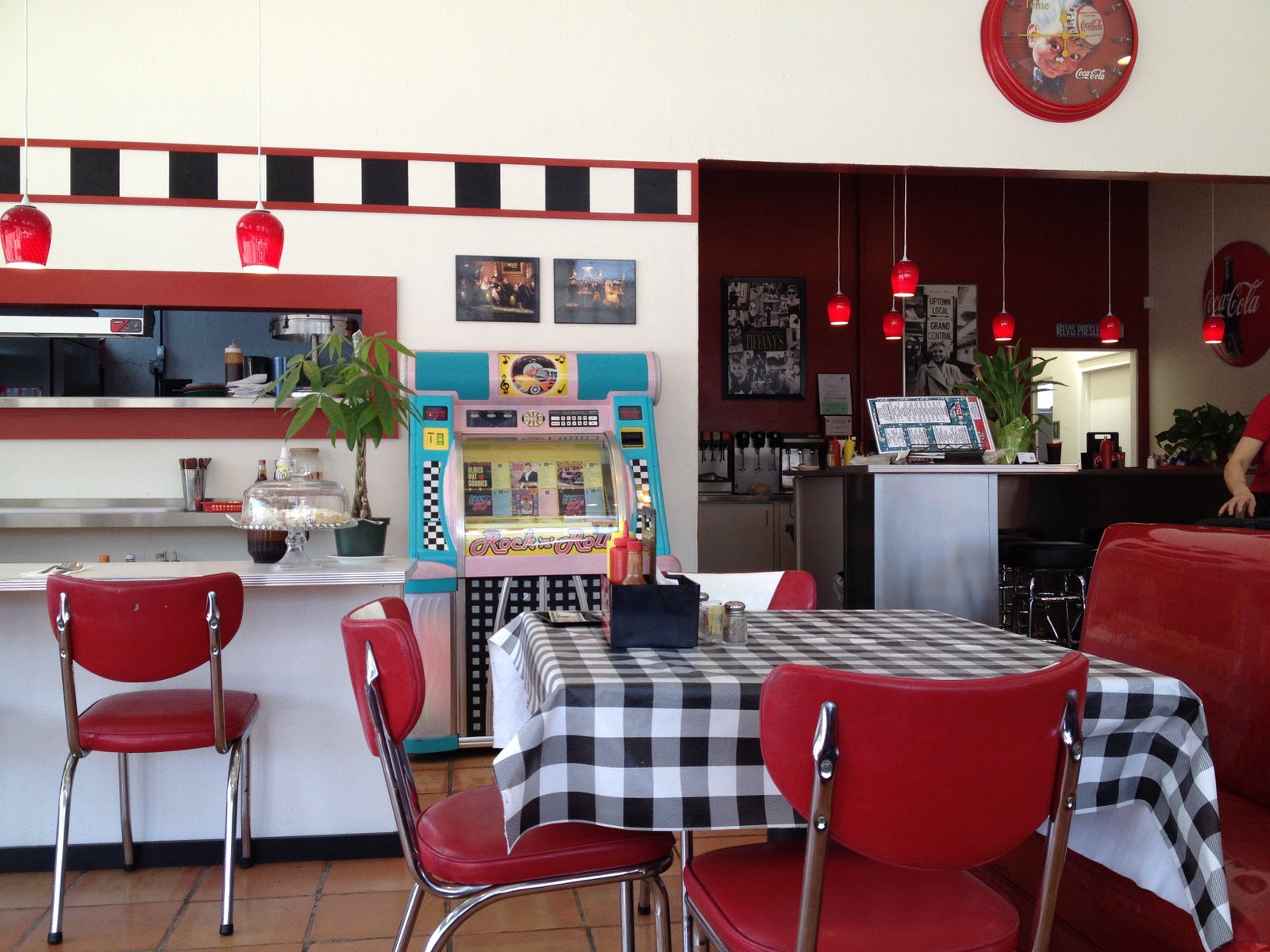 The decor is 50's style with corresponding music being played overhead. The menu is kind of kitschy, with some silly names for items (the Jed Clampett omelet, Patsy Cline, Jailhouse Rock, Milton Berle, Ricky Ricardo, Mickey Rooney, Dean Martin, Patty Page…then again, these names may not mean anything to you. I digress)