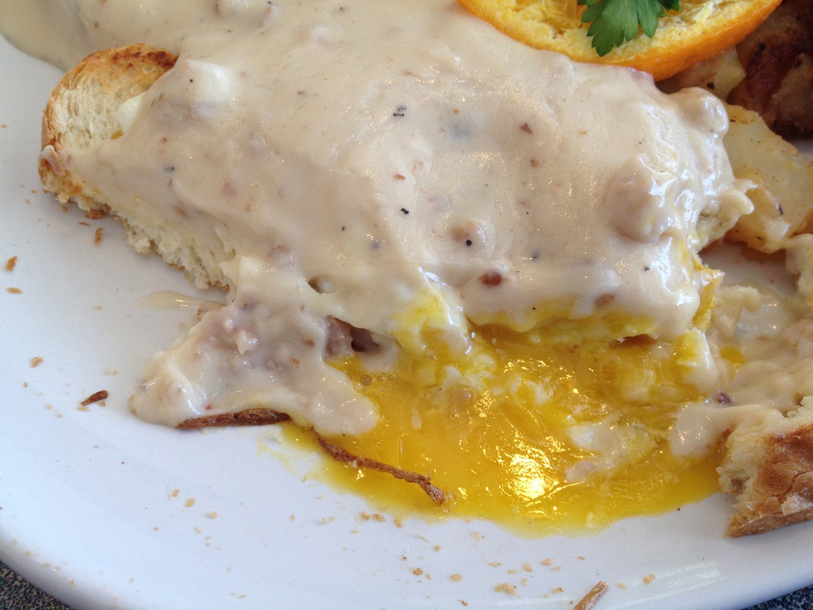 This is the 'Bye Bye Birdie' ($7.99). Holes cut into two thick pieces of white toast, an egg dropped into the hole and cooked to my request (easy); all of it topped with a really great sausage gravy. Served with Country Potatoes, and either bacon or sausage, this was another winner. A great meal. So glad I took the wrong turn and discovered this gem.