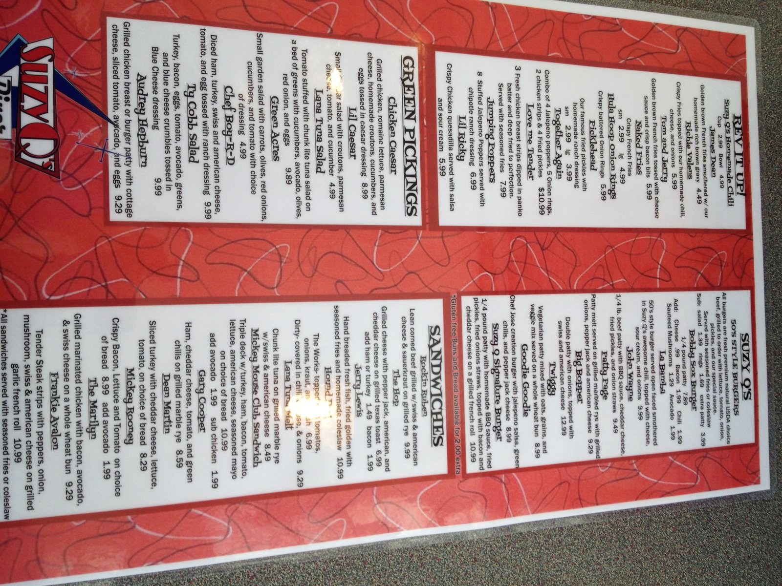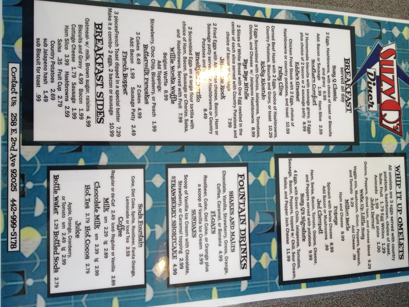 Suzy Q's Diner 258 E. 2nd (at Juniper) Escondido 92025 Closed Mondays. Open Tues-Thurs 7-3, Fri 9-9, Sat-Sun 7-3