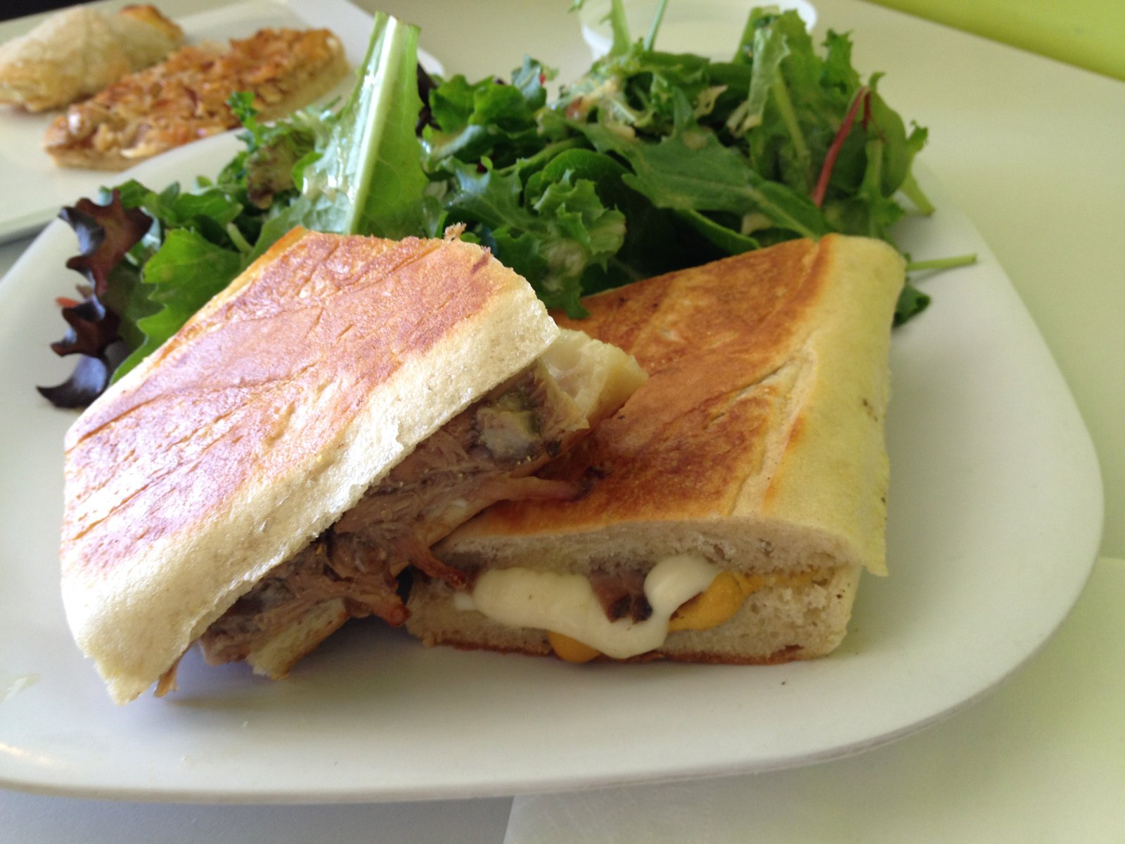 There are also five sandwiches on the menu. Above, the Cubano ($8). Slow roasted pork, thin slices of ham, Swiss cheese, mustard and pickles. Pressed and toasted on freshly baked organic bread and served with a side salad. This is the way a sandwich should be.