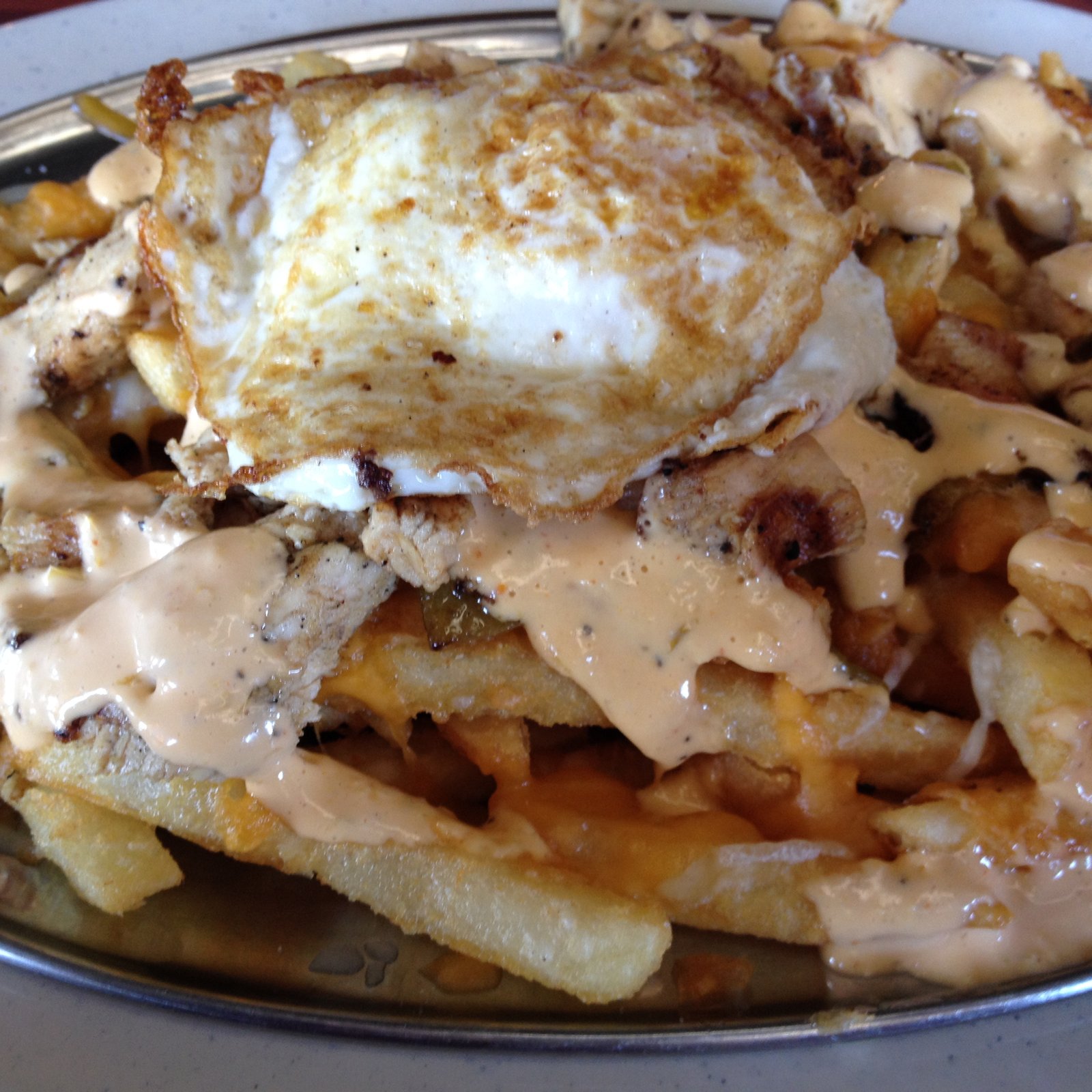 Above, my choice: Meanie Fries ($9.95). Fried potatoes (nice and crisp) topped with cheddar cheese, ortega chiles, chopped grilled chicken, "meanie sauce" (it's spicy!) and a fried egg. Technically a proper meal, due to the protein toppings. This was indeed, very good with the 'meanie' sauce part pretty much necessitating a few swigs of good, cold beer.