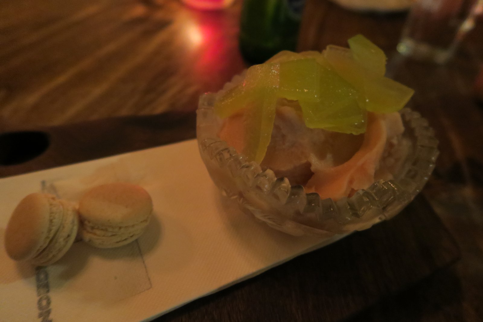 While I considered ordering the signature foie gras profiteroles, there was just no way I could put away anything more after all this rich food. We went with the Cucumber-Watermelon sorbet ($6) instead, which was still way too much for us to finish.