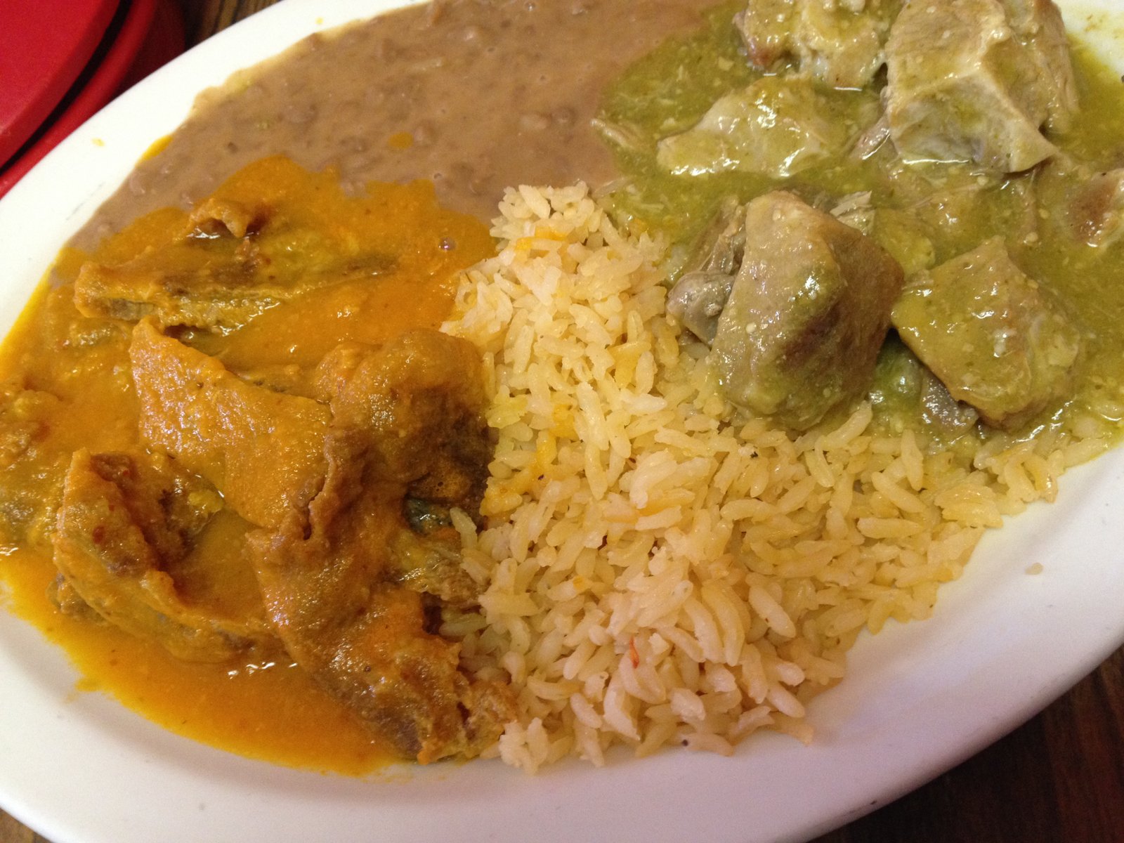 The top plate has the red sauce covering chicharron (fried pork rinds) and the green sauce covering pork pieces.