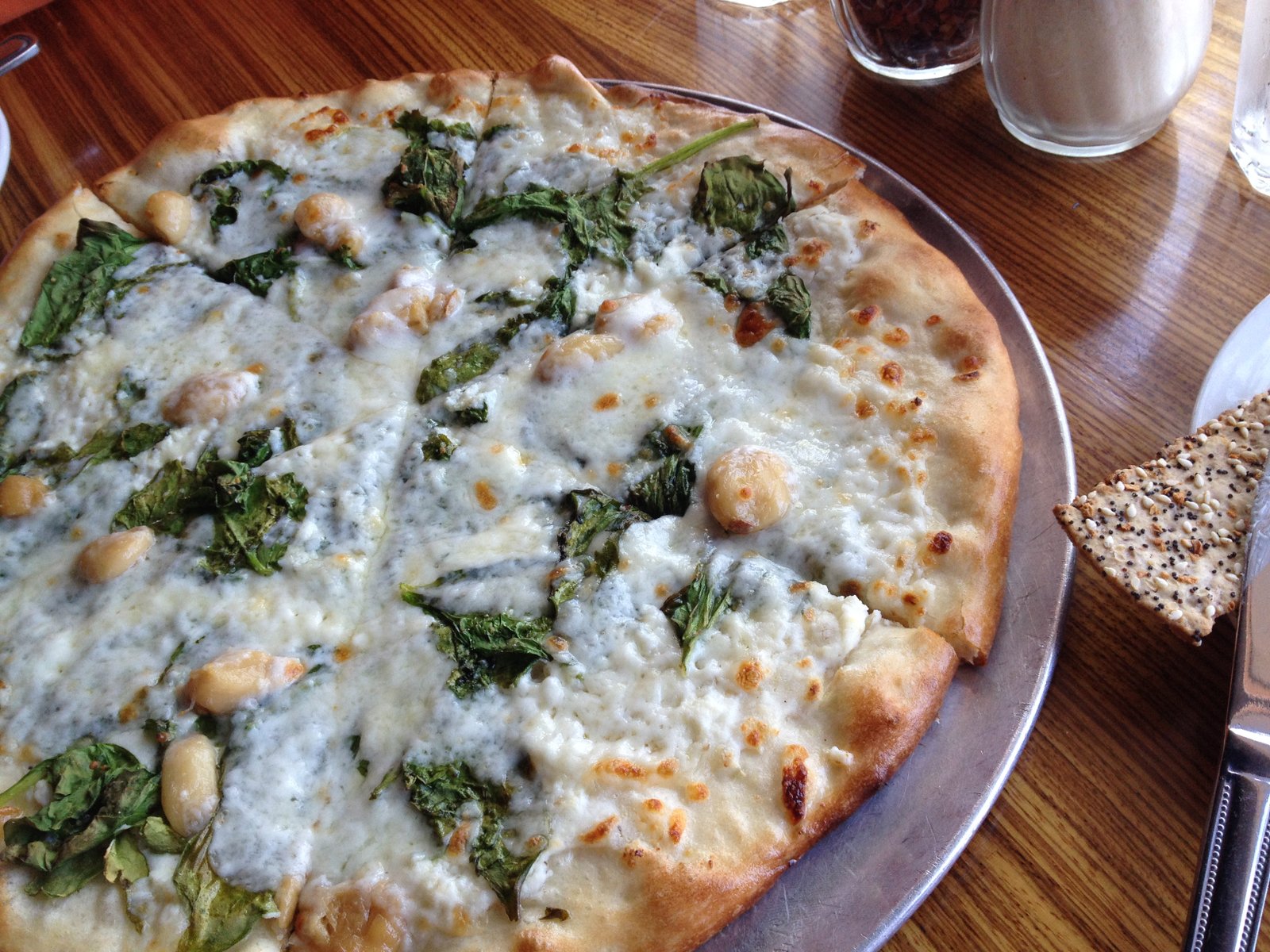 The pizza with cheese and spinach looks so good. Ricotta on pizza is the best.