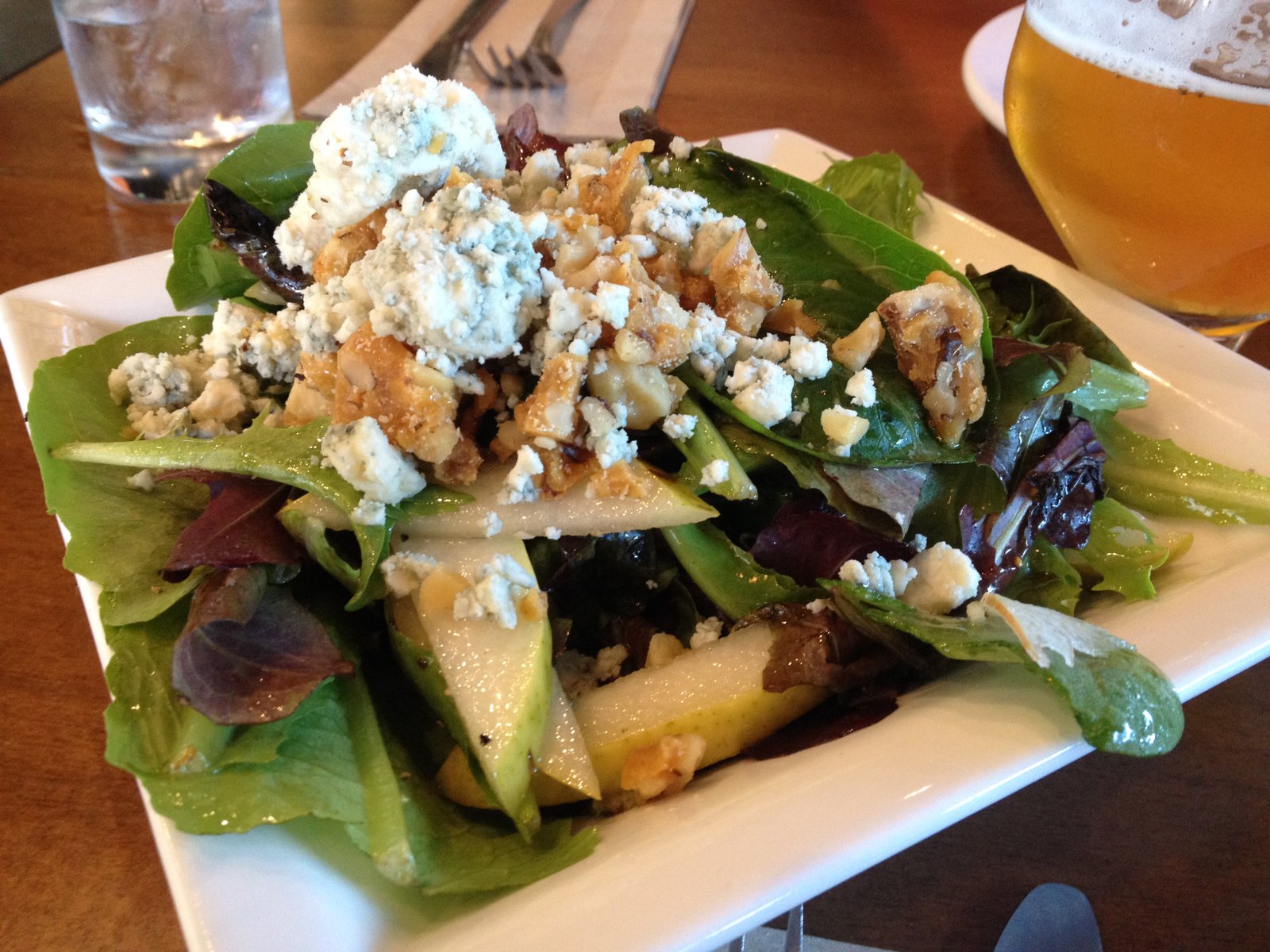The URBN salad (small, $7). A nice mix of greens topped with gorgonzola, pears, a walnut brittle and a light vinaigrette. This could be a meal for one (the bowl is deep), but we shared. It was very fresh and flavorful.