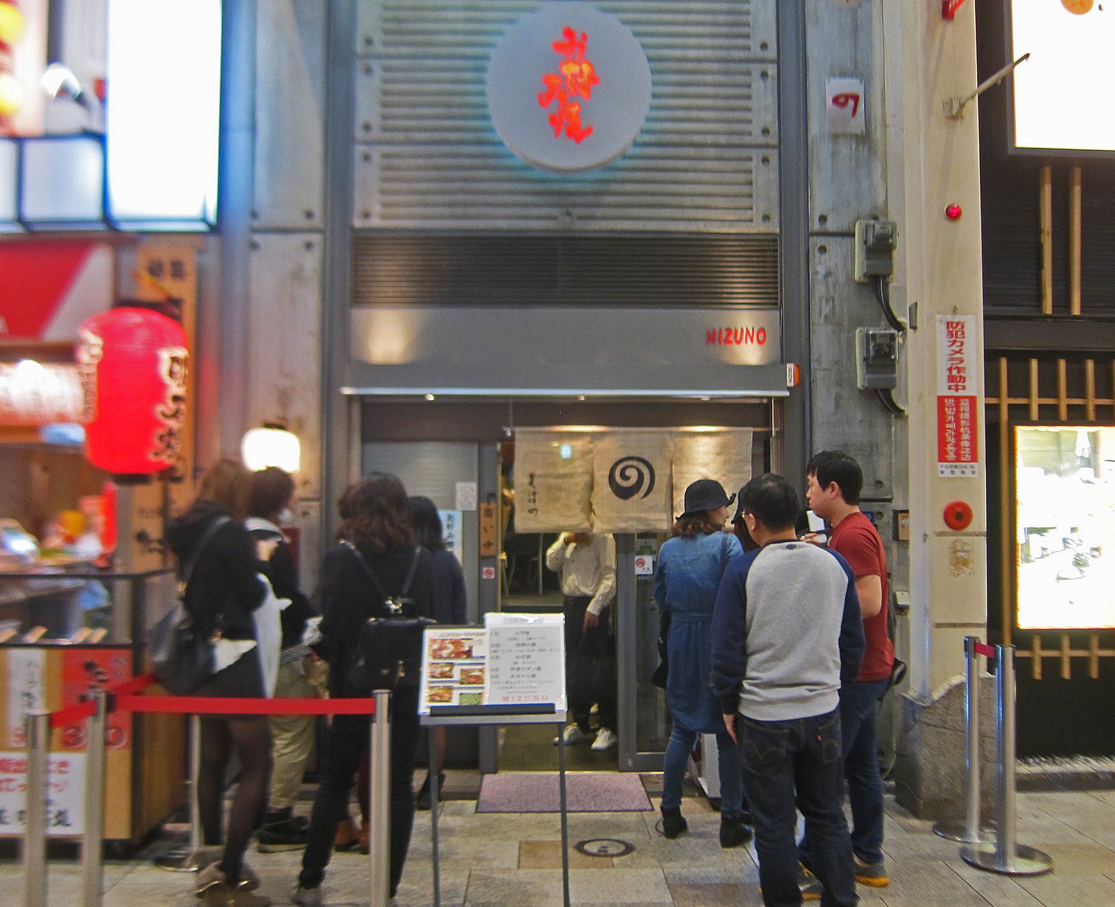 This was Osaka and I had a short list of places; none of which were particularly fancy or expensive. The one we both really wanted to try was Mizuno. So there we were, pocket wifi going strong, knowing we were close. In fact there was that dot on the screen….but it seemed we kept walking around that dot. What the heck. Finally, we saw "Mizuno" actually written on a small sign in front of a restaurant, with a pretty good sized line.