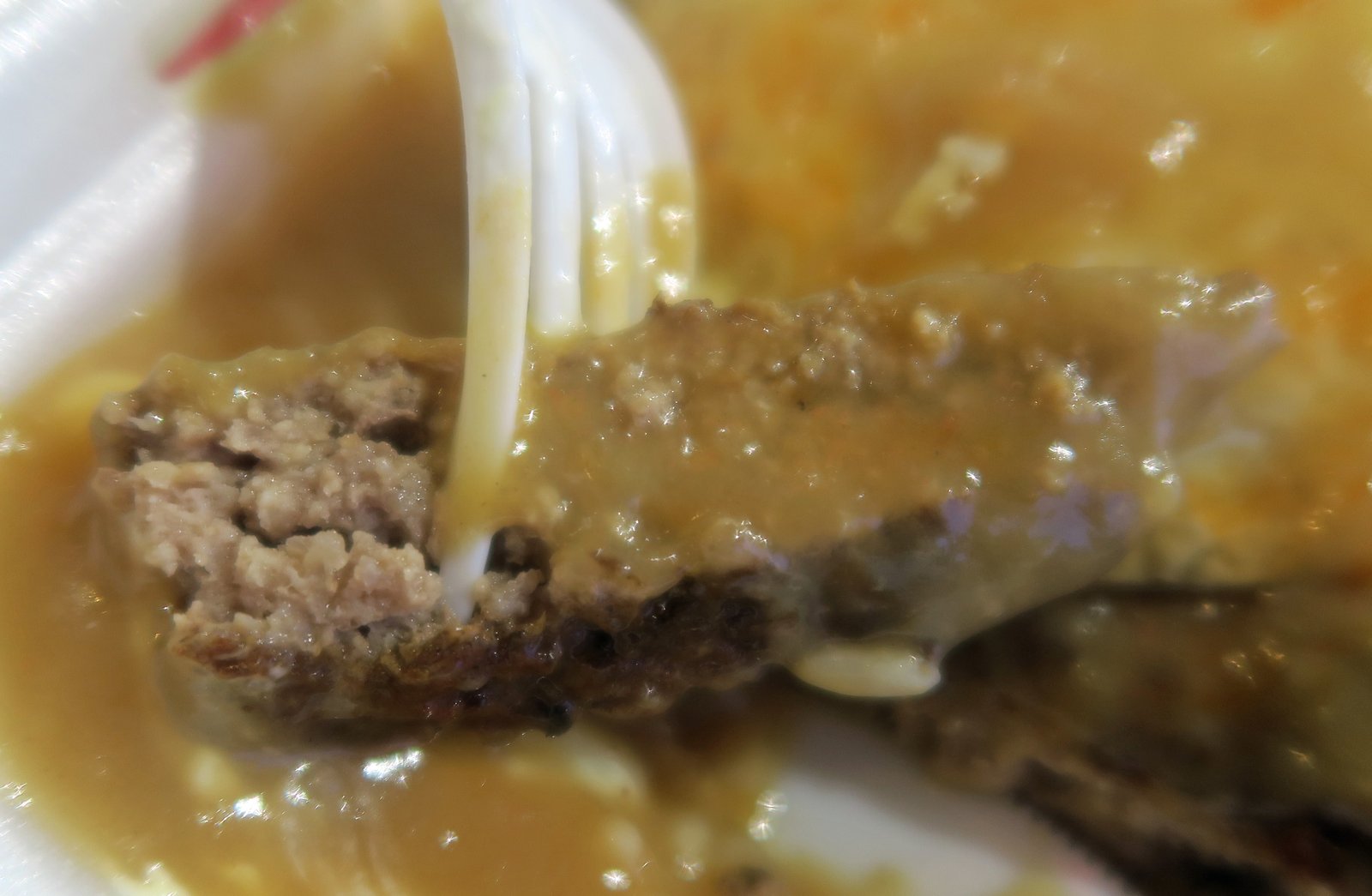 Good lord, preformed and cooked to death. Lacking in seasoning. Like eating gritty bits of shoe leather….still, it was barely edible. Thank god for the gravy…well, maybe not.