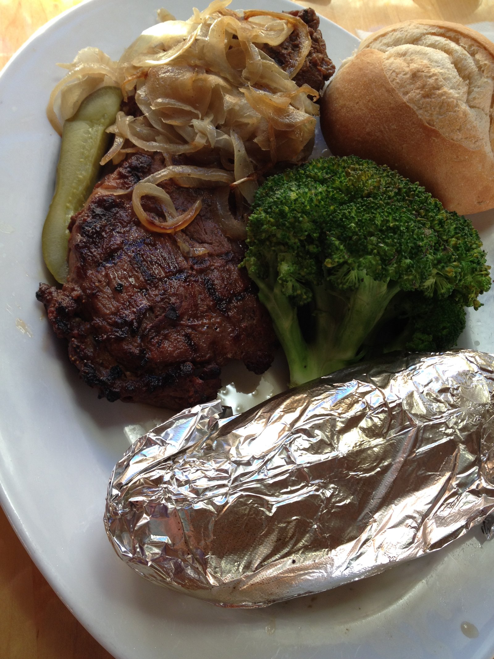 The Mister's New York Strip ($14.98, including the stein of beer). It was topped with the grilled onions (which I received unceremoniously on my plate right after photos were taken) and His chosen sides of a baked potato and broccoli, along with a slice of sweet pickle and a roll.