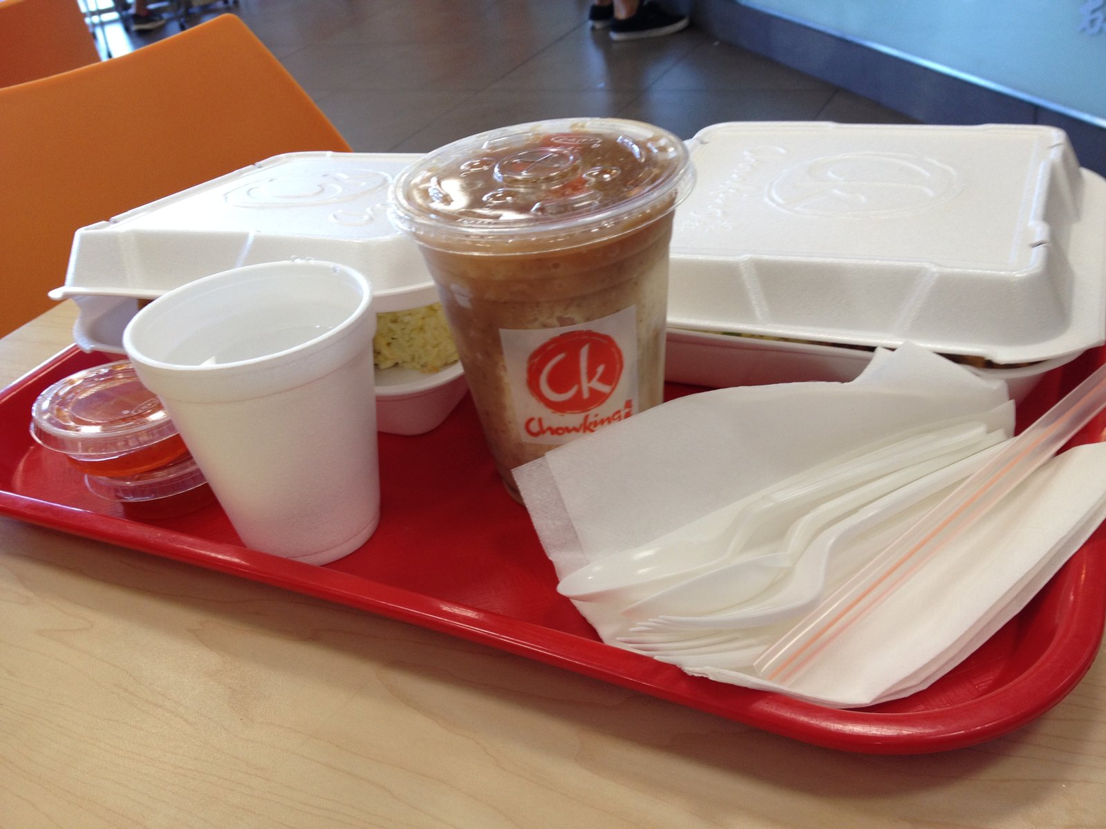 This is what we ordered for one lunch the other day. That's a coffee milk tea (because I can never decide). I like how the styrofoam packaging is manufactured with steam holes, so the contents, if fried, will remain crispy.