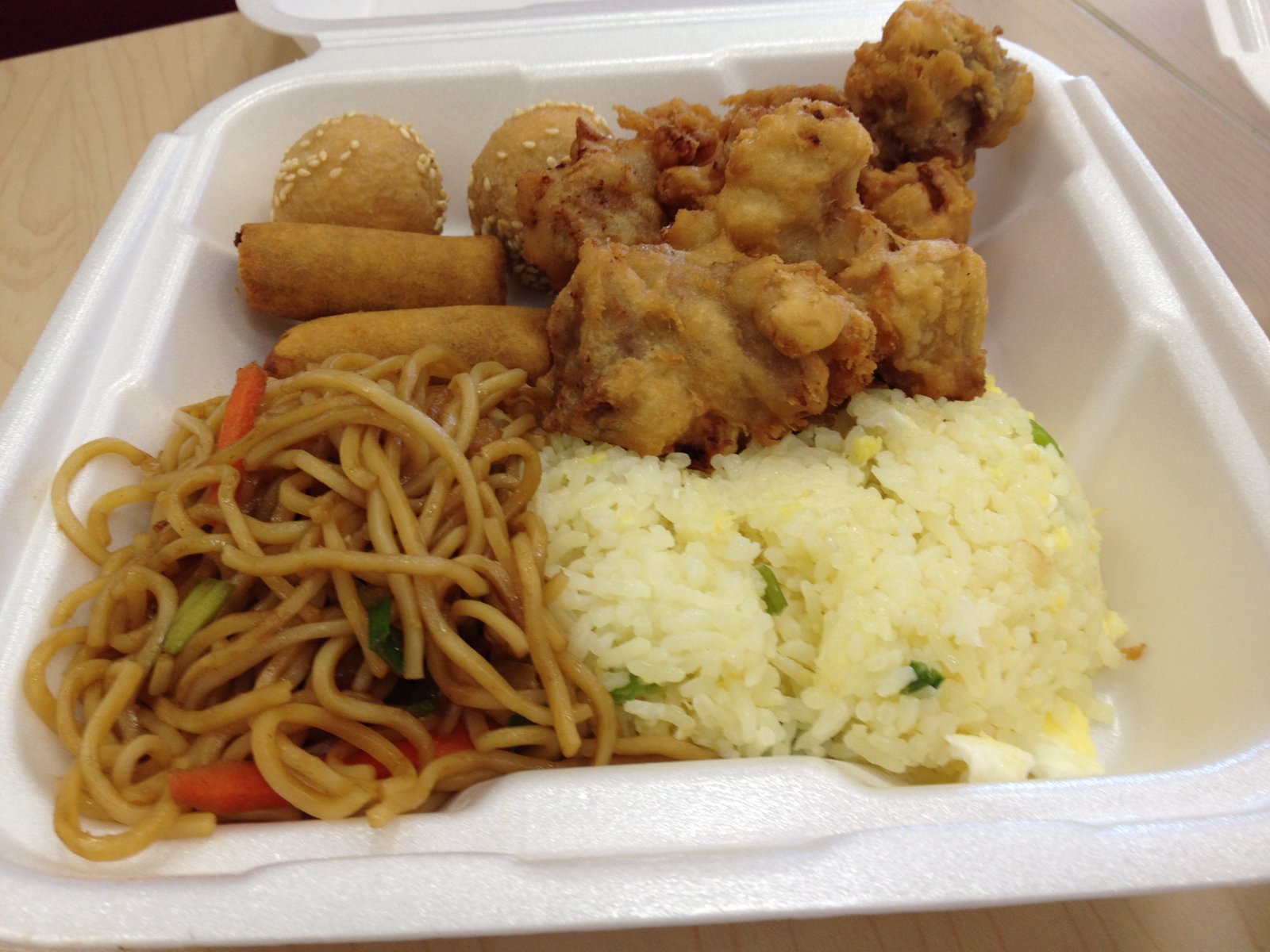 The Garlic Chicken Lauriat ($5.99). A 'Lauriat' is a rice meal, so is essentially the meat (nicely battered and fried dark meat chicken pieces) and rice along with veggie Canton noodles, two small veggie spring rolls and two red bean paste filled sesame balls…not lumpia, not pancit…Chinese food…