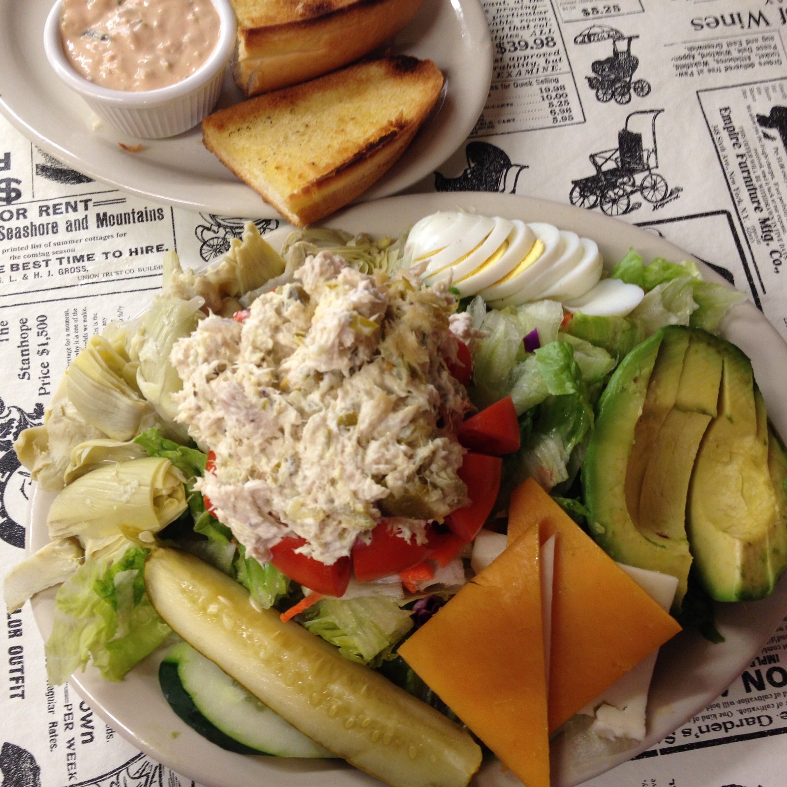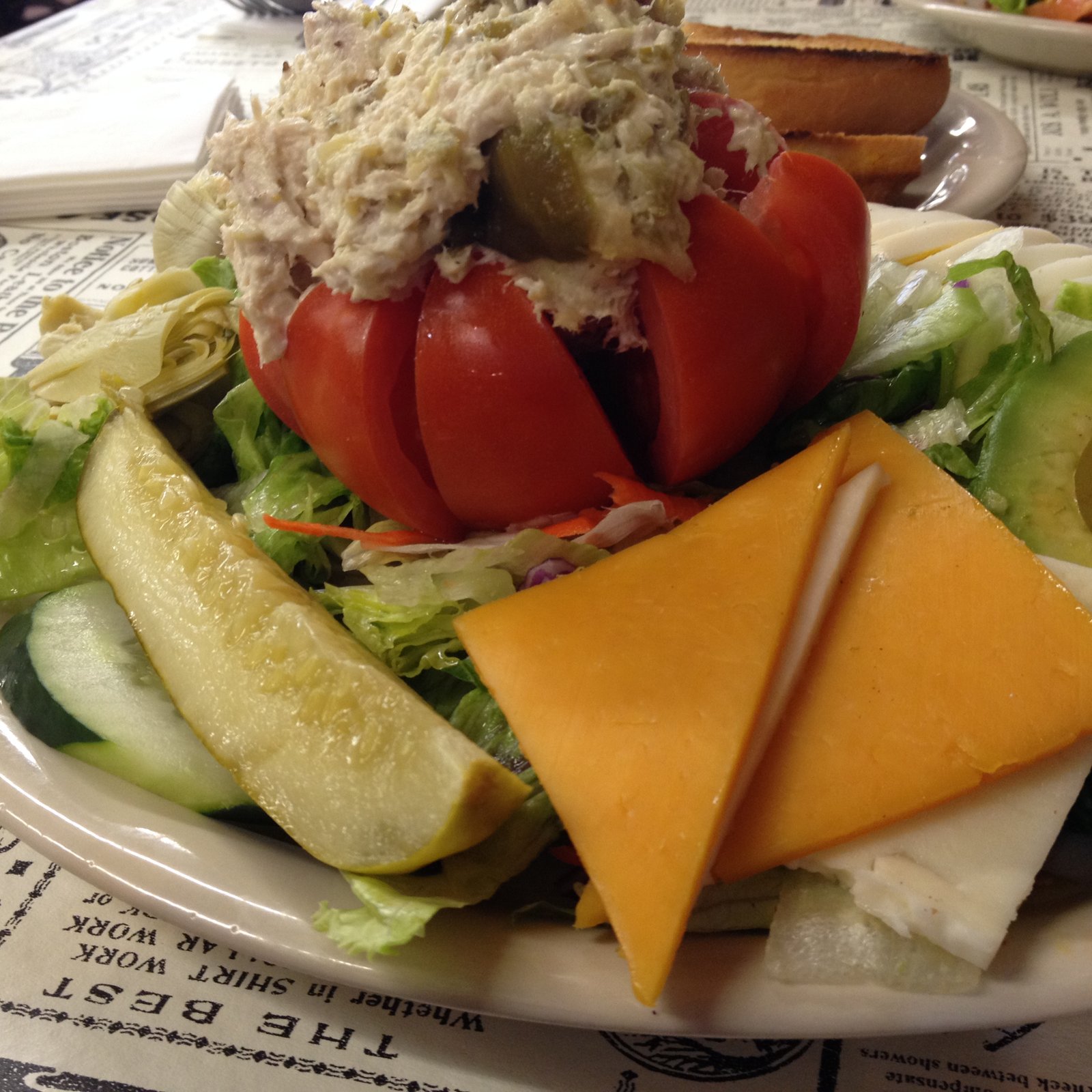 The (excellent) tuna salad stuffed tomato is on top of a bed of lettuce- enough to be its own salad. The accompaniments- artichokes, hard boiled egg, avocado, cheese and pickle fully round out the plate and then there's the delightful toasted garlic bread…a meal. A wonderful meal.
