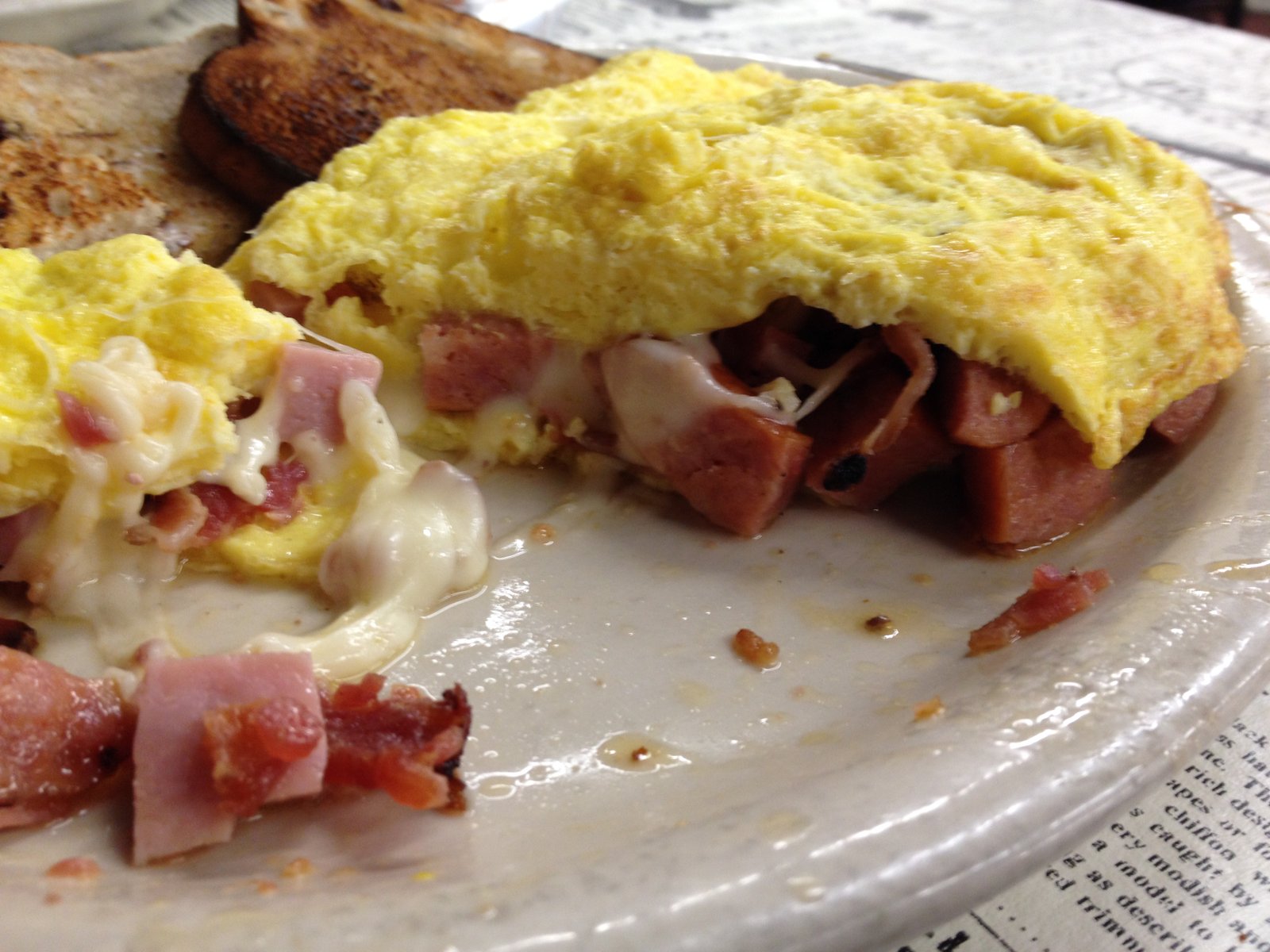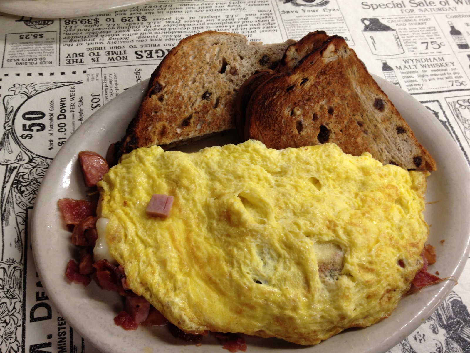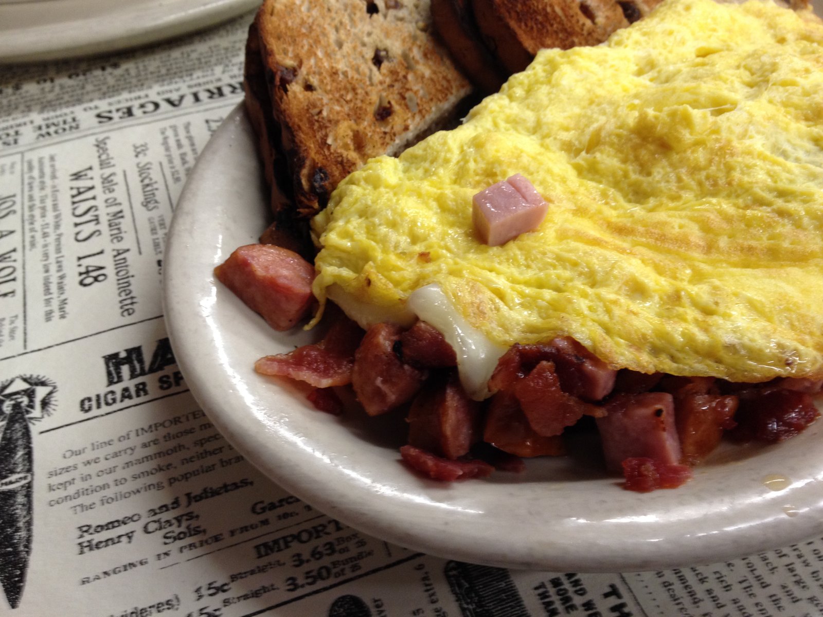 One note: the omelets are HUGE. They come with toast, no potato. If you'd like Dudley's date walnut toast, it's an extra 39 cents.The #89 omelet ($11.09 plus 39¢ for the fancier Dudley's toast). Bacon, ham and Polish sausage with Jack cheese. A wonderfully filling, protein packed meal. So flavor packed.