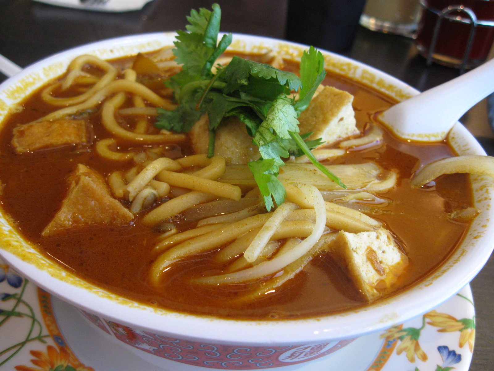 The coconut curry noodle soup has a lightly spicy, rich and mellow curry broth: Along with the pieces of fried tofu, chicken chunks, shrimp, and some veggies hide amidst the spaghetti like noodles.