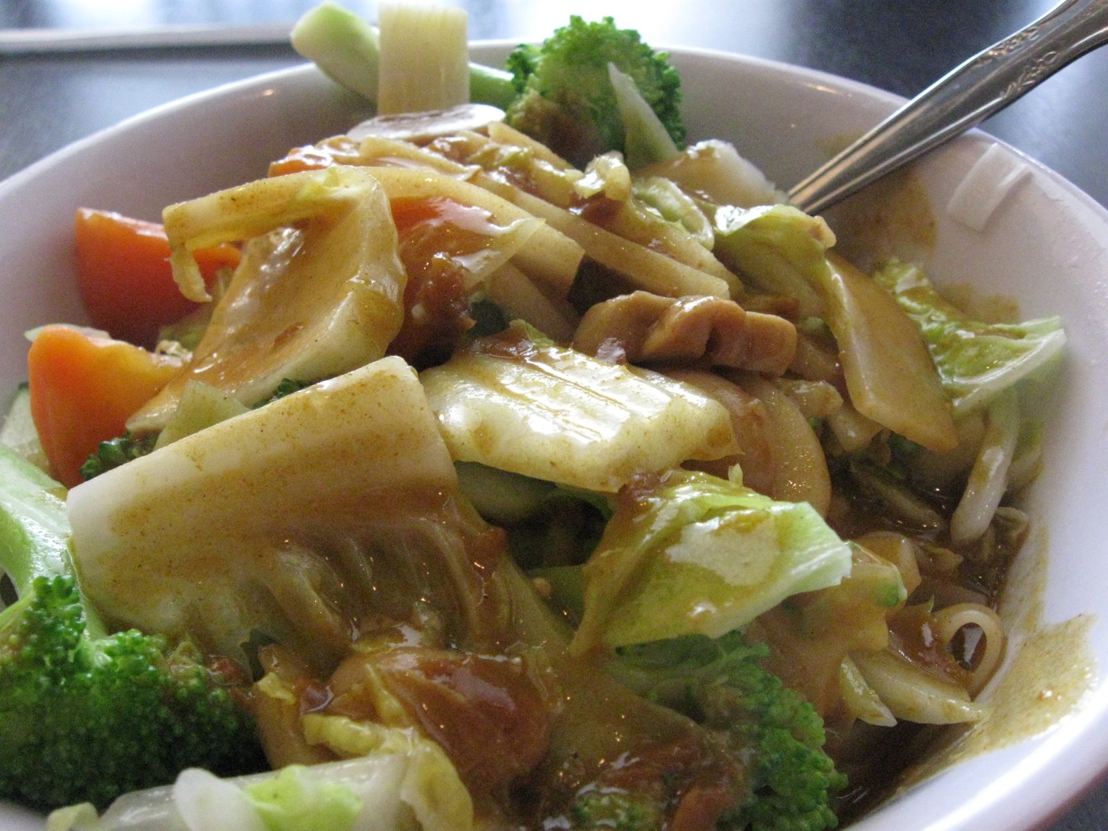 One can also have the a similar Curry flavored sauce (or teriyaki) on a bowl of noodles (or rice) either with just mixed vegetables – as in this picture – or with barbecued pork, jumbo shrimp, or teriyaki chicken: Actually cheaper than a lunch special.