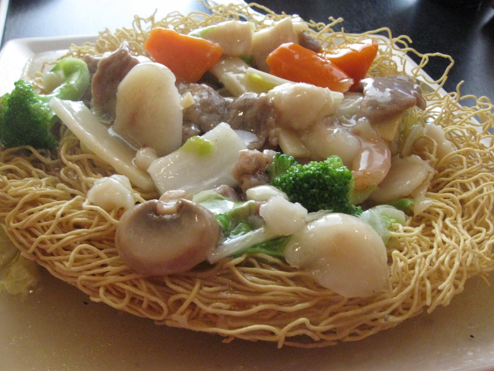 At current prices, all of the noodles I've pictured are well under $10 – that’s a good deal to me. For just a few additional shekels, you can get this beautiful “Julianne Pan-Fried Noodle": The crunchy golden nest holds a nice combination of beef, chicken, shrimp, and assorted vegetables in a mild sauce. As well prepared as the somewhat similar dish at China Max.