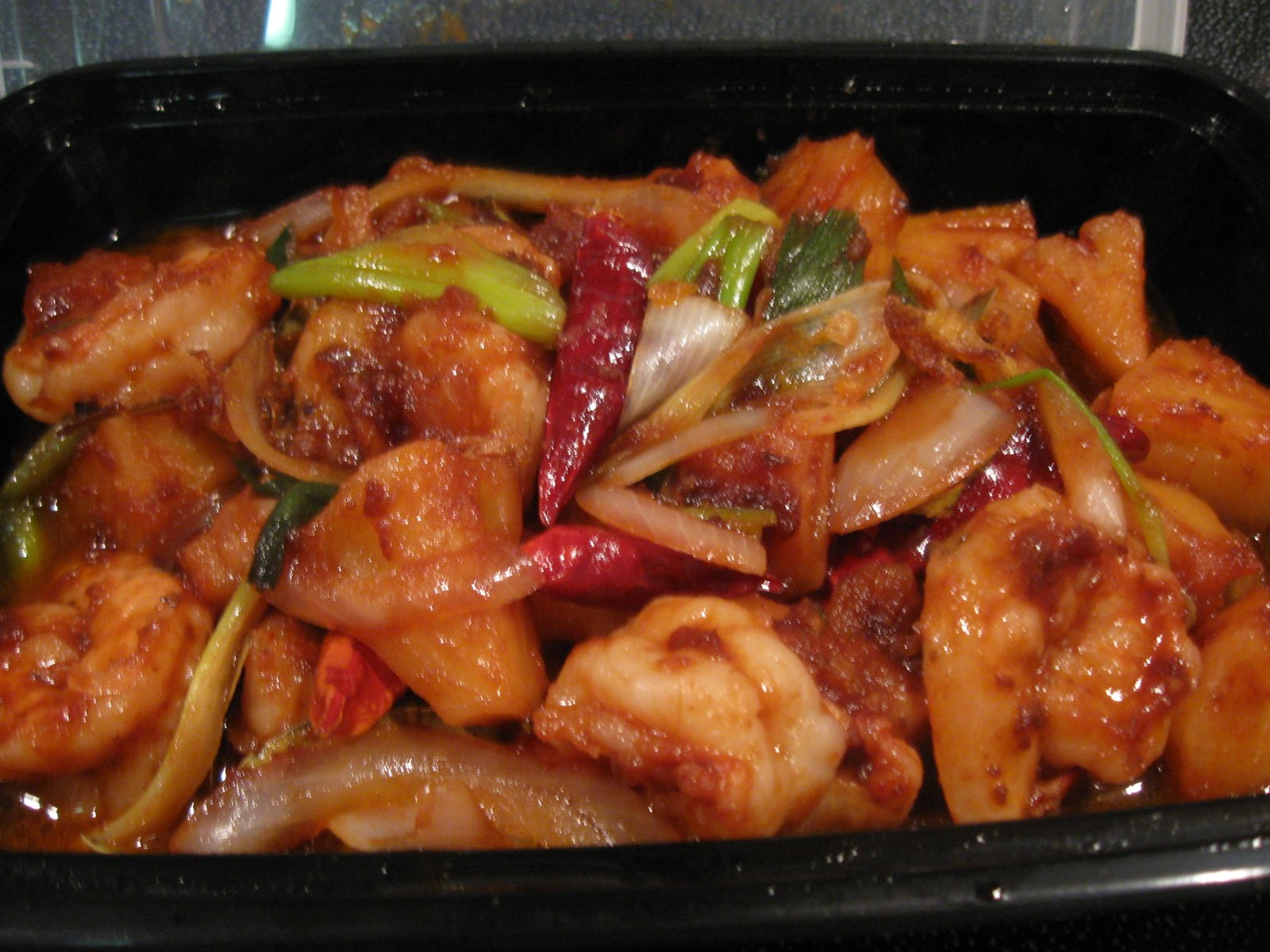 The plentiful shrimps have good flavor, complemented by numerous chunks of fresh pineapple, abundant slices of onions, bits of dried shrimp and whole dried chilies. The sweet tangy chili sauce brings it all together.