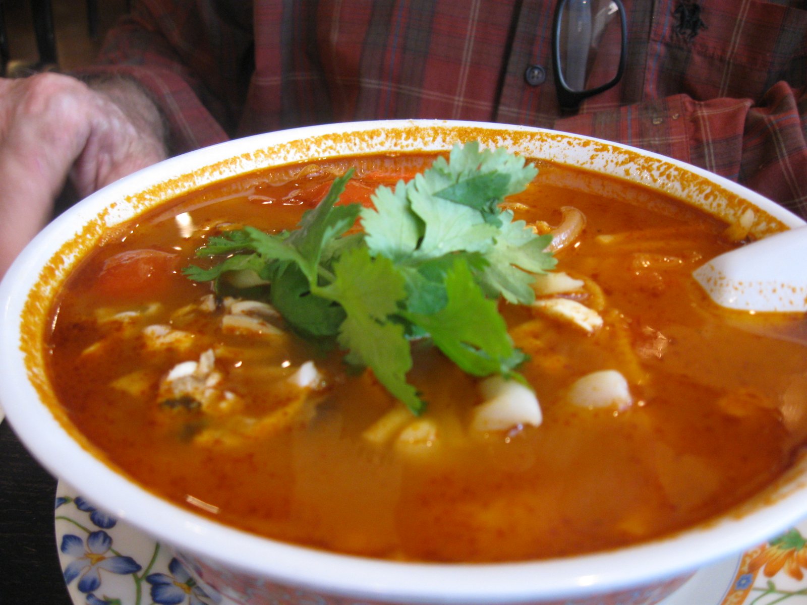 The seafood tom yam noodle soup is very tasty and very spicy: To my gringo palate, this tastes like authentic tom yum soup broth with distinct chile hot and lemon grass sour flavors, a lot of noodles, and some seafood and veggies.