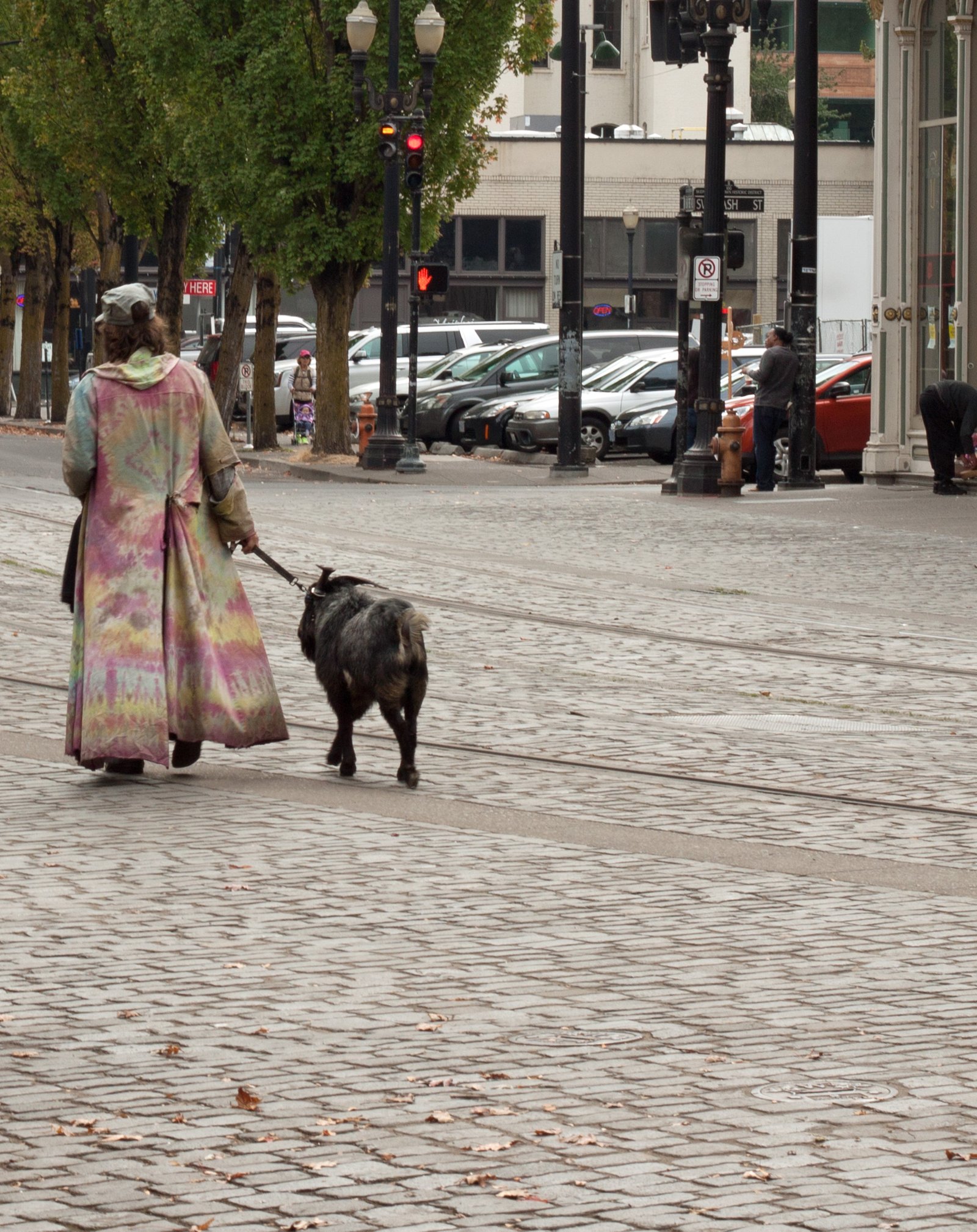 We found a table nearby, sat down, had some conversations with other folks (people still talk to strangers in Portland), and watched the procession of beautiful well-trained dogs that strolled through and alongside the market. It was like a dog show. Of course, Tina and I forgot to take any pictures of the dogs. So, to make up for that, here is a picture of a local out walking his goat: