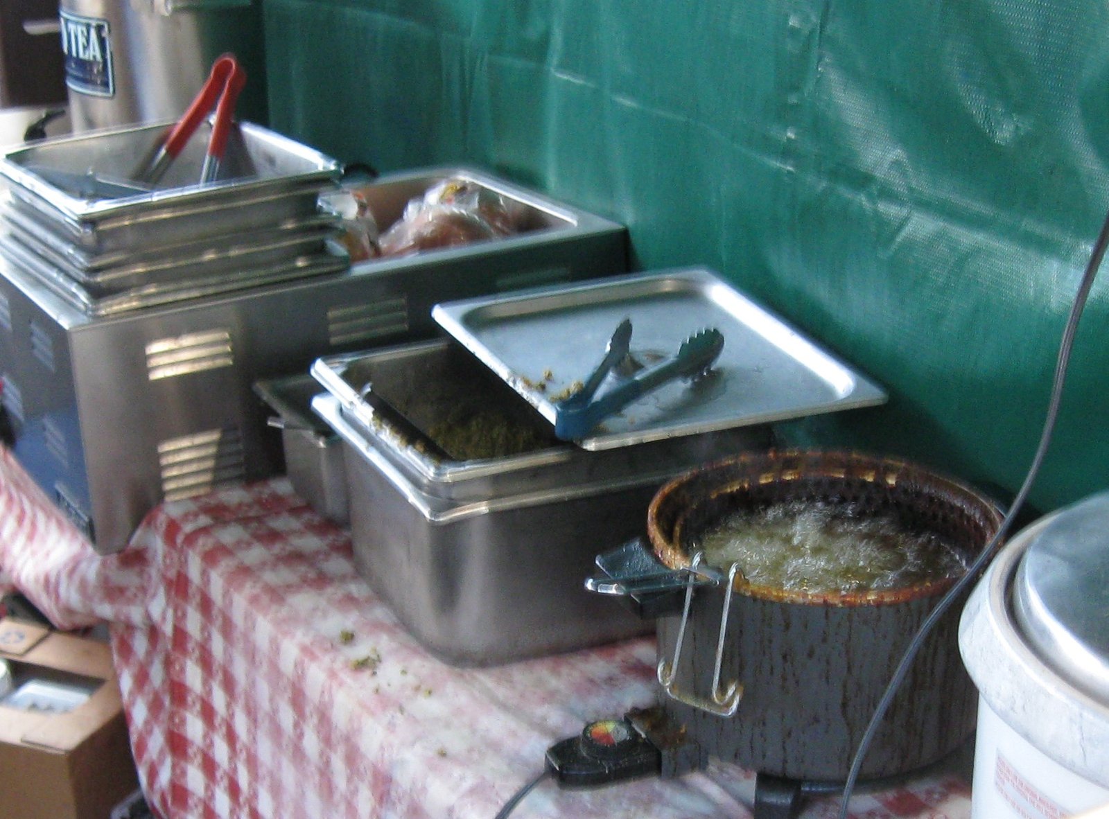 As we were tasting it, the man (it was a one-man show) scooped out two greenish balls of chickpea mush, and dropped them into bubbling hot oil: