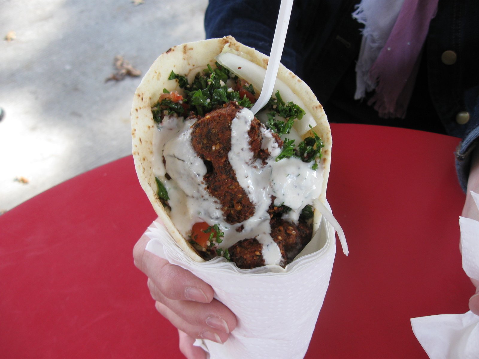 And it tasted great. The exterior was dark and crunchy, the interior nicely balanced between smooth and coarse. The pita, falafel, tahini, tabouli, and veggies made memorable food music together. Outstanding!