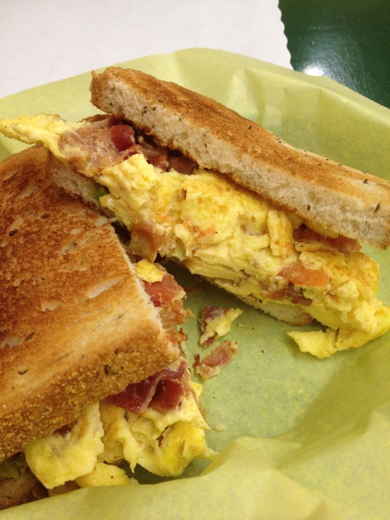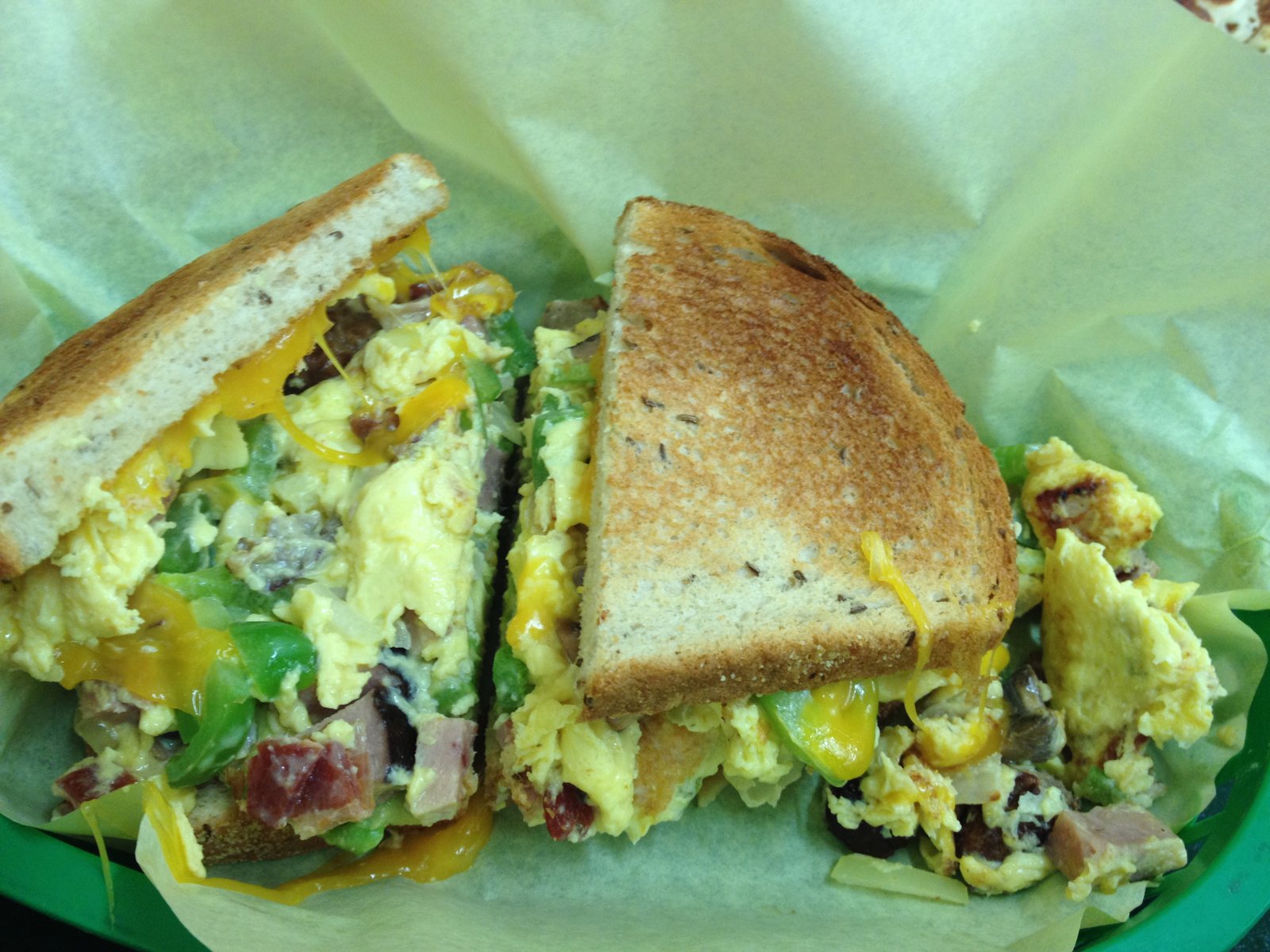 Two visits, I've ordered each of the breakfast sandwiches on the menu. Both with rye toast. The top photo is the "Ultimate Breakfast Sandwich" ($7.75)- scrambled eggs, cheese, bacon, ham, sausage, mushrooms, bell pepper and avocado. Hearty and good.