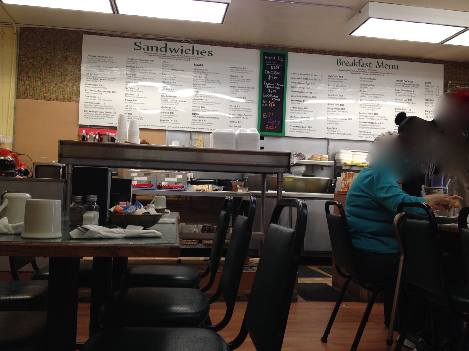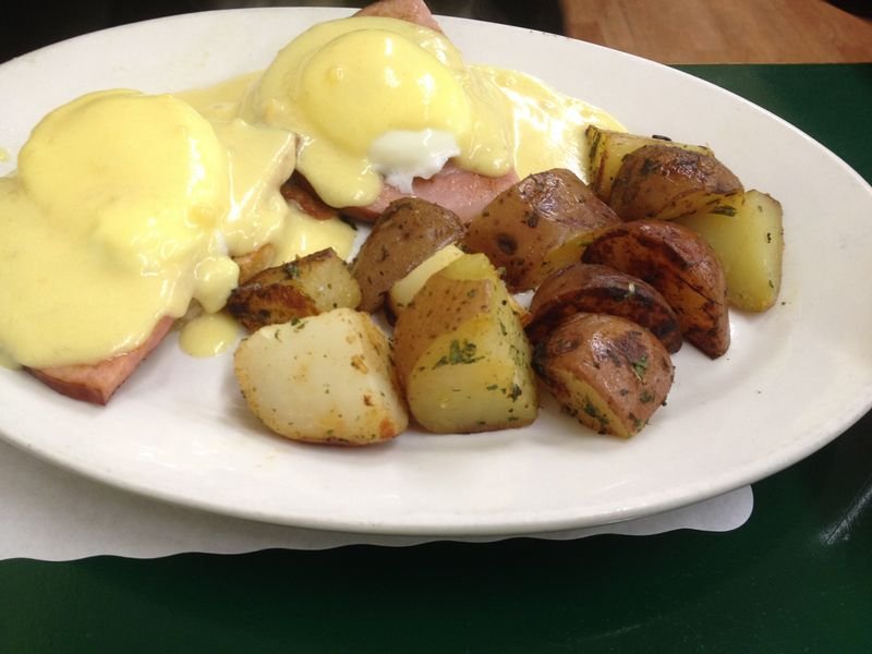 The bottom photo (directly above) is the simpler "Breakfast Sandwich" ($5.75)- Scrambled eggs, cheese (you have a choice of cheeses) and ham or bacon or sausage. Bacon in this case. Unfortunately the Eggs Benedict is no longer on the menu, but a "Grilled Bone In Ham Steak" with eggs ($9.75) is. The Benedict and its sauce was very good when we ordered it. The home fries are the same as in this photo.
