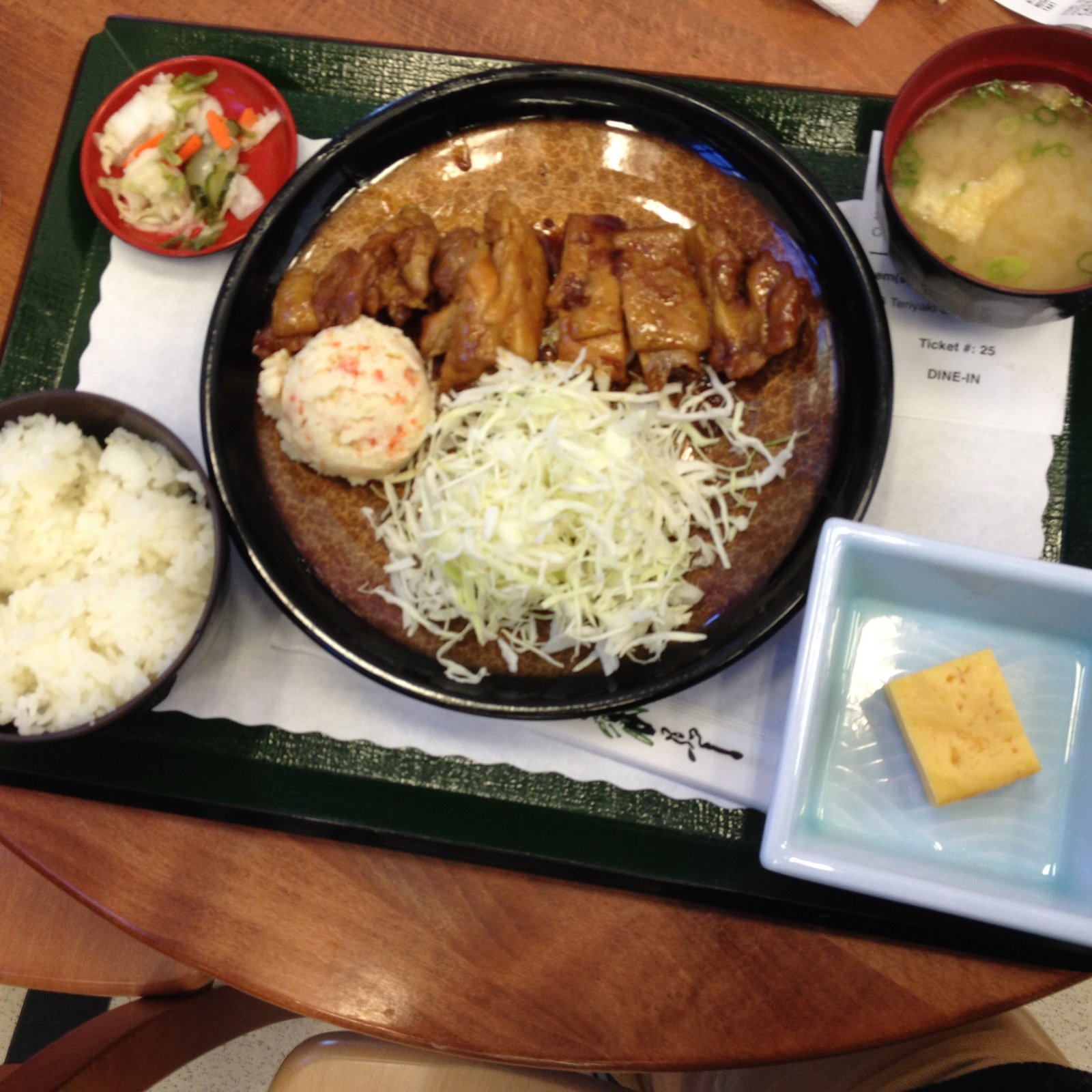Musashiya, owned by Mitsuwa, (similar to the way Seafood City owns Grill City locations inside the Food Court areas inside their stores) has several meals which are less than $10. This one is chicken teriyaki. They make the sauce from scratch and it isn't too sweet nor is it salty. Just enough. Everything you see comes with it: the potato salad, sliced cabbage, pickles, miso, rice and in the bottom right corner, a piece of tamagoyaki, a layered omelet made with rice vinegar and sugar, which I consider 'dessert'.