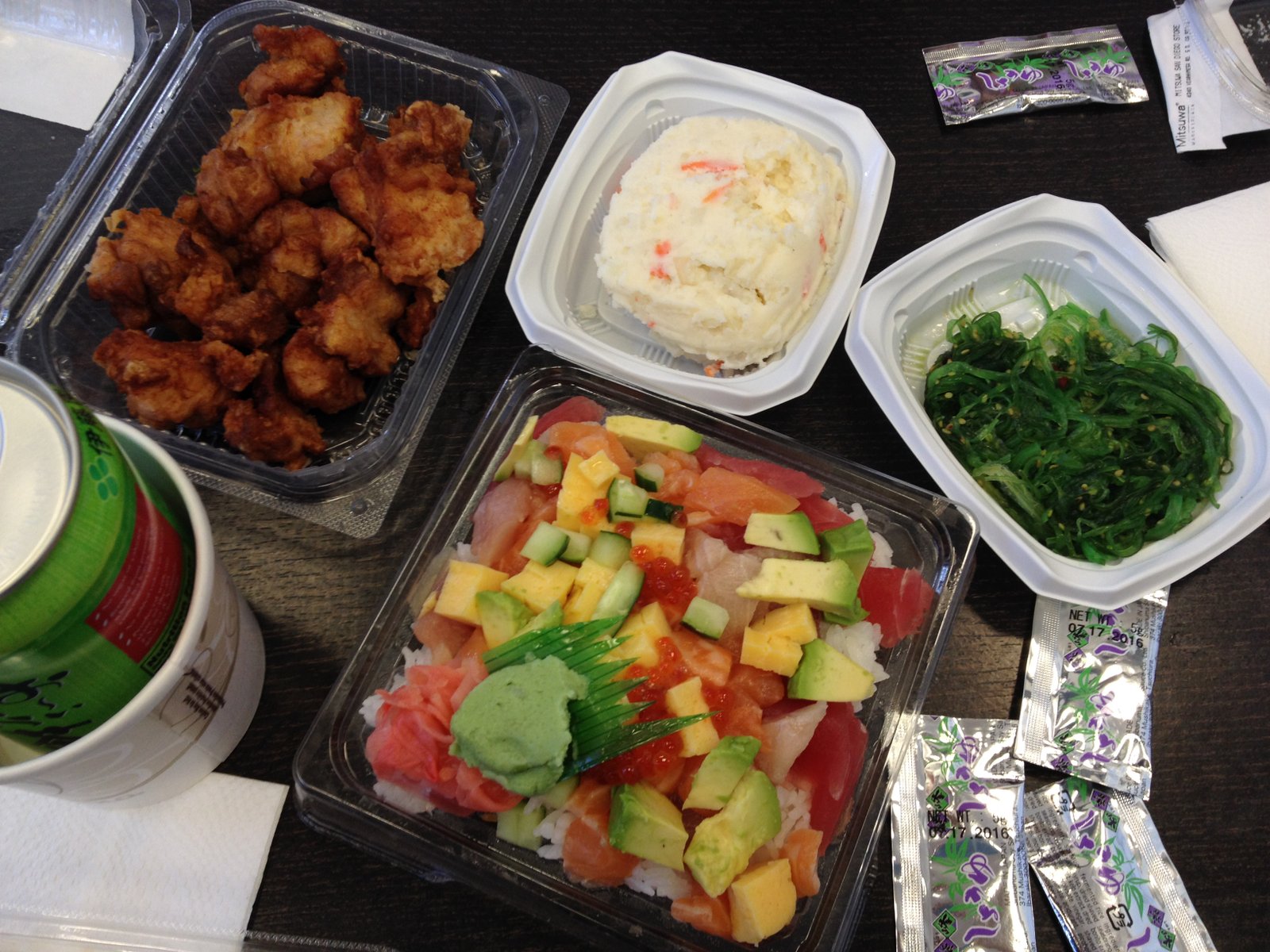 Eventually we agreed on the above purchases- chicken karaage, Japanese potato salad, seaweed (all sold by the pound) and a chirashizushi bowl (on top of sushi rice) ($8) and a can of hot tea ($1.29). Heated tea cans, as well as refrigerated ones are inside one beautifully designed appliance, also against that right wall.