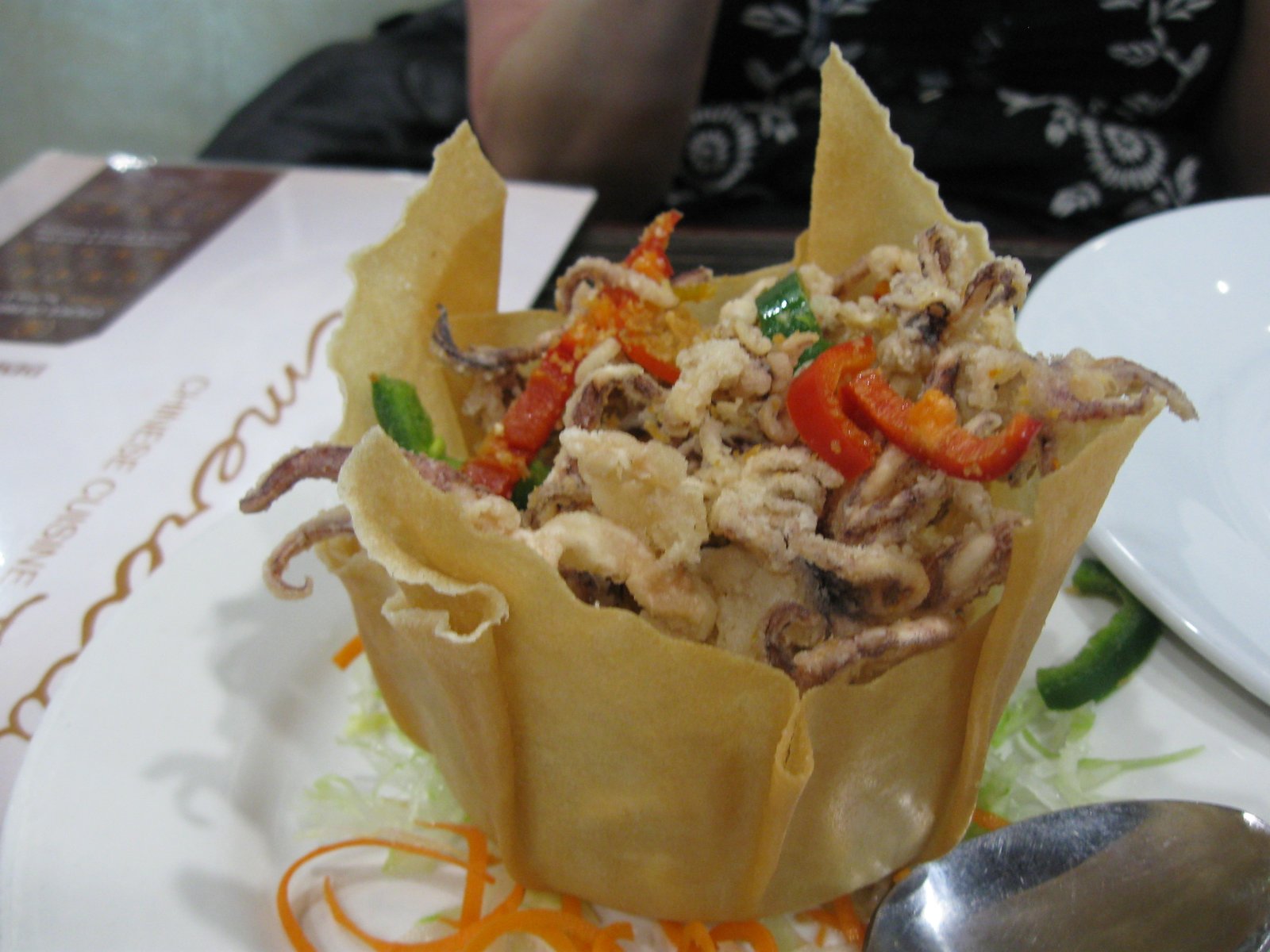 This has been one of my favorites at Emerald for many years. Smaller portion now, but classier presentation. The tentacles are pleasantly crunchy/chewy and a little salty. Now served with two sauces –spicy ketchup and hoisin:
