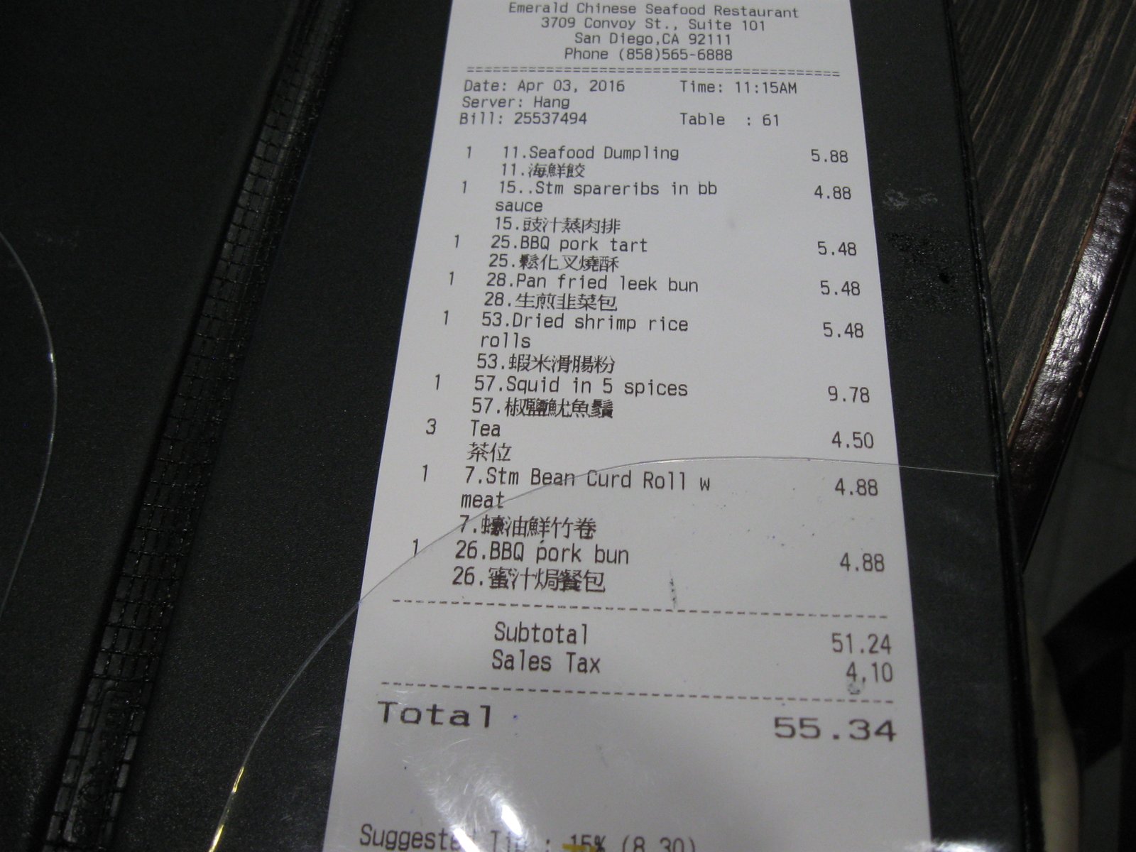 I haven’t been to Emerald in forever. For that matter, I haven’t had dim sum in SD for awhile. I usually go to Jasmine but I do prefer the menu card system like at China Max. Looks like the tea charge was $1.50 which I thought was the going rate.