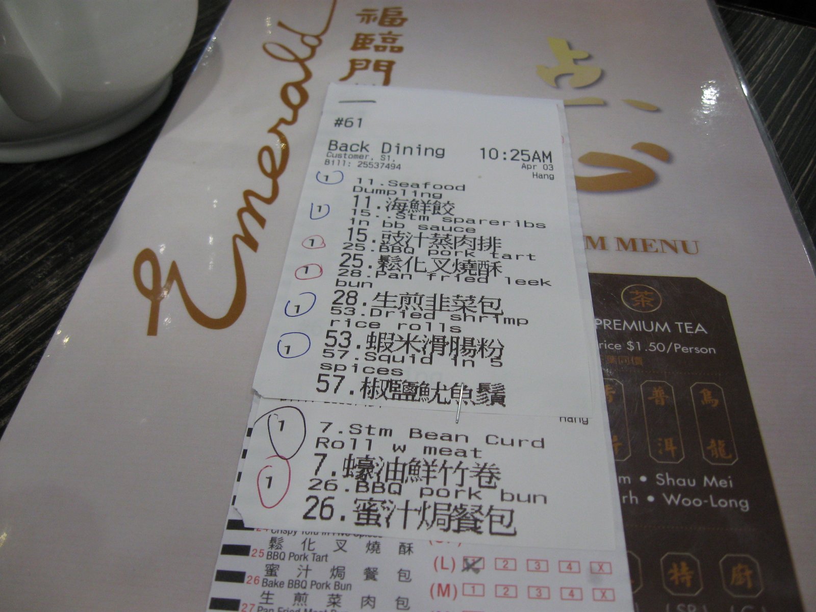 Wait, $4.50 for one pot of tea? The entry on the receipt has a 3 by it, so maybe they accidentally added 2 more pots of tea to the receipt? I haven’t been to Emerald since about 2009 but used to go regularly before that. Odd to see it with such a different color scheme now.