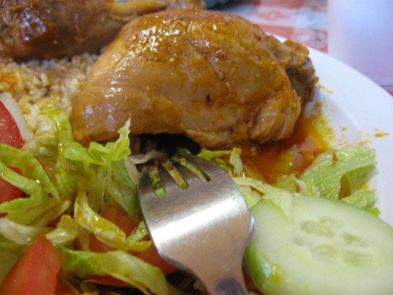 The chicken was moist, fall apart tender, and savory. The rice was perfectly prepared and married happily with the tomato sauce. The lettuce etc. was more condiments than salad. Downhome goodness.