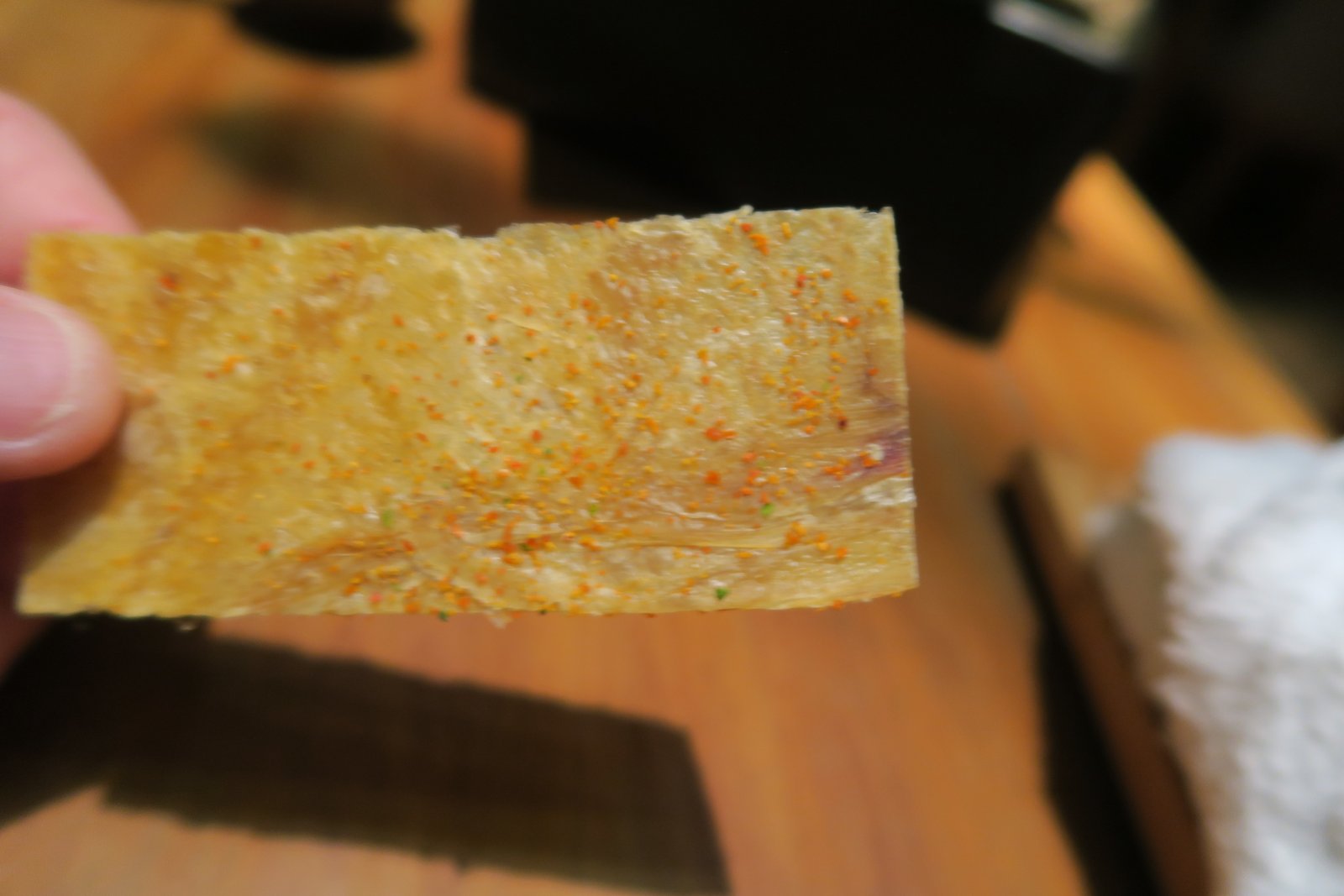 What really got our attention was that sauce at the bottom of the photo above. We put some on the chicken skin and cracked up! Pachikay Sauce……it's scallion, ginger, soy…..this tasted like the dipping sauce for for Kwai Fei Chicken! Basically, the sauce for what we call "Cold Ginger Chicken" back home. This had a more complex flavor, the ginger seemed to have been blanched or cooked taking the edge off the flavor, some smokiness, it was also a bit on the salty side as well. Still, we really enjoyed the chicken skin.